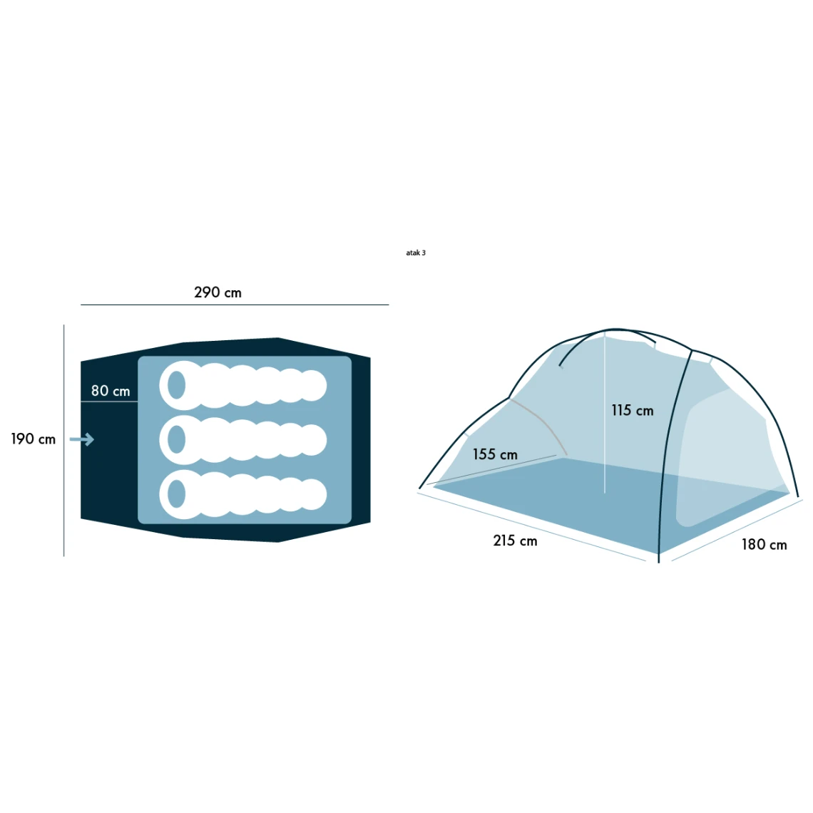 Ultraleichtes Touristenzelt Warg Das Atak 3 ist für drei Personen ausgelegt und dank der ausgeklügelten Duraluminium-Konstruktion das leichteste selbsttragende Zelt für drei Personen der Marke Warg. Das geringe Gewicht wurde durch ein Nylon-Außenzelt mit Silikonbeschichtung erreicht, das leichter, stabiler und abriebfester als Polyester ist. Hervorragende Stabilität und Widerstandsfähigkeit bei Wind werden durch die Verwendung eines einzigen Stützstabs und dessen Verzweigung in drei Unterstäbe gewährleistet.