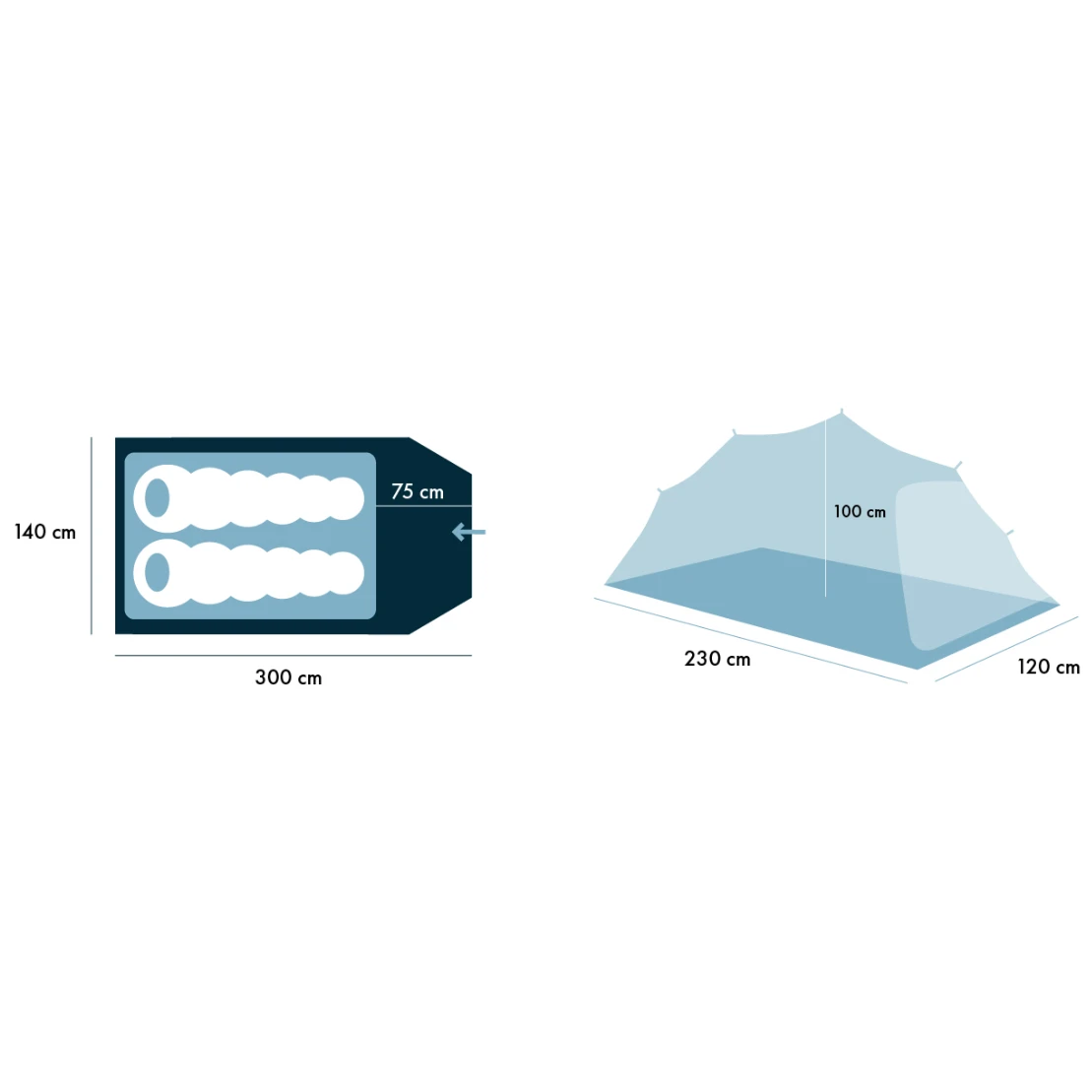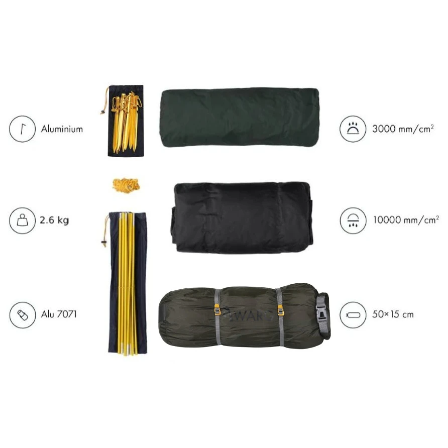 - Material Außenzelt: 20D Nylon Ripstop, beidseitige Silikonbeschichtung, 3.000 mm H2O
