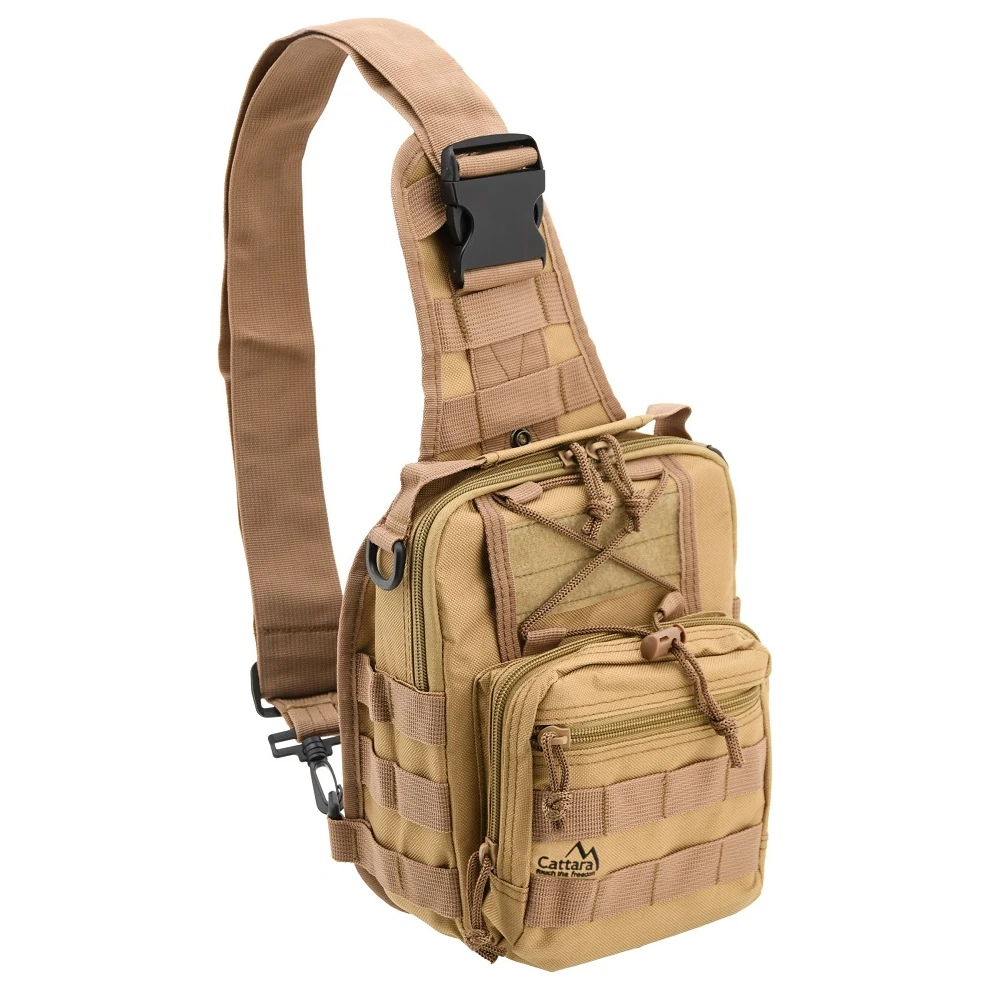 Der leichte und dennoch äußerst geräumige Schulterrucksack Cattara Army 10 l ist ideal für ganztägige Wanderungen in der Natur. Es überzeugt durch seine übersichtliche Aufteilung mit mehreren Taschen und Molle-System zur Anbringung zusätzlicher Ausrüstung. Der Rucksack ist mit einer Haupttasche, zwei Seitentaschen, drei Innentaschen und einer Rückentasche mit Belüftung ausgestattet. Die Außentaschen sind mit stabilen Reißverschlüssen ausgestattet, die Haupttasche verfügt über einen Zwei-Wege-Reißverschluss. Die Innentaschen hingegen verfügen über Schlaufen und einen Verschluss. Der Rucksack besteht aus 100 % Polyester mit einer wasserdichten PVC-Innenschicht. Eine weitere Besonderheit ist die Möglichkeit, ihn über der Schulter zu tragen, ihn aber auch mittels Klettverschluss am Gürtel zu befestigen.