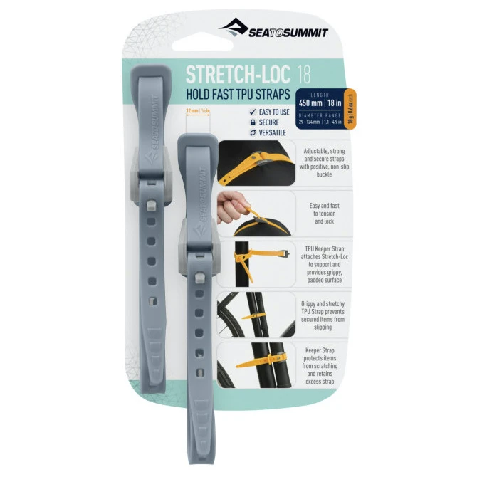 Der universelle Stretch-Loc 17-Gurt von Sea to Summit bietet eine einfache und schnelle Lösung zur Sicherung der Ausrüstung, egal ob es um die Befestigung einer Flasche am Fahrrad oder von Paddeln an Dachgepäckträgern geht. Das Band besteht aus äußerst strapazierfähigem TPU-Material, das flexibel, rutschfest und fest ist. Das Band verfügt über eine rutschfeste Schnalle und einen Riemen, mit dem sich schwer zu verbindende Dinge leichter verbinden lassen. Dieser Gurt dient gleichzeitig als Polsterung, um Ihre Sachen vor Beschädigungen zu schützen. Einzelne Streifen können zu einem langen Streifen zusammengefügt werden, der Ihren Anforderungen entspricht. Die Packung enthält 2 Streifen.
