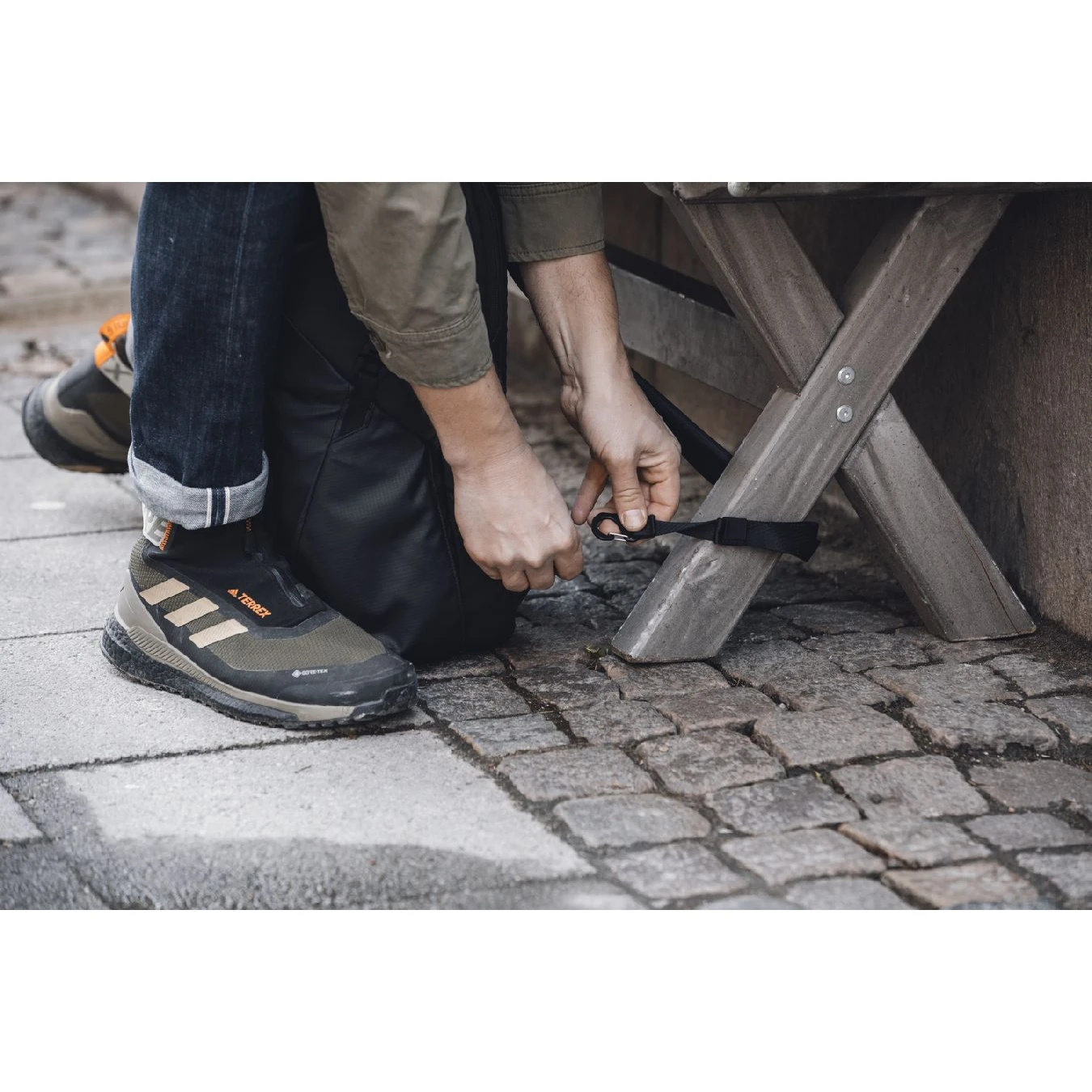 - Der Schultergurt lässt sich von der Unterseite des Rucksacks abnehmen und zum Diebstahlschutz um einen festen Gegenstand wickeln.