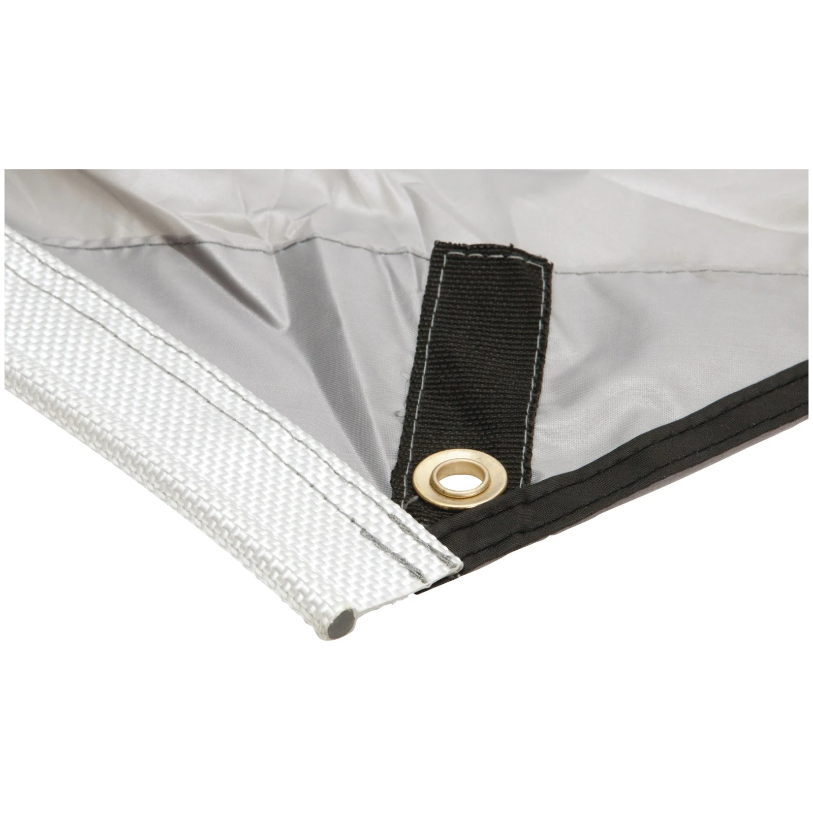 Plane mit extra starker Kordel zur Befestigung an Caravanreling Travel L - 4,6 x 2,4 m der Firma Bo-Camp lässt sich auch im aufgerollten Zustand schnell und einfach am Caravan/Wohnmobil befestigen. Darüber hinaus ist ein eigenständiger Aufbau mithilfe der Ösen in der Plane und den mitgelieferten Ankerseilen und Heringen möglich. Dank der PU-Beschichtung mit einer Wassersäule von 2000 mm ist diese Plane wasserdicht. Inklusive praktischer Tragetasche.