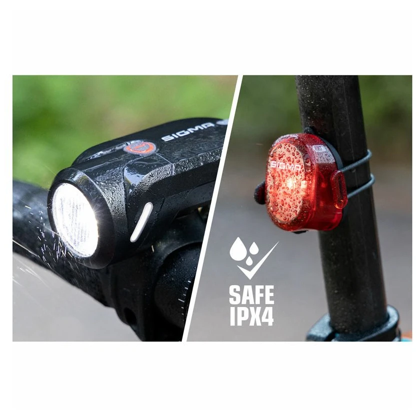 Günstiges Fahrrad- Lichtset für alle. Mit diesem Set können Sie immer und überall hingehen. Im Set enthalten ist das Nugget II Rücklicht Sigma. Blitz- und Frontlicht Sigma Aura 35 USB.