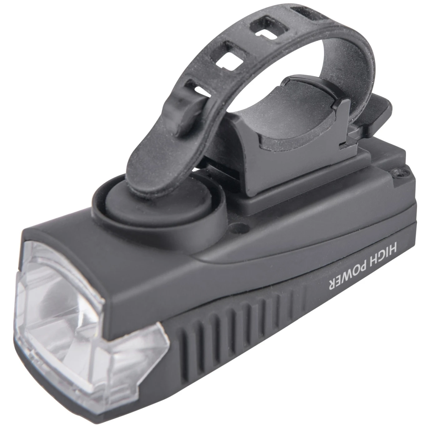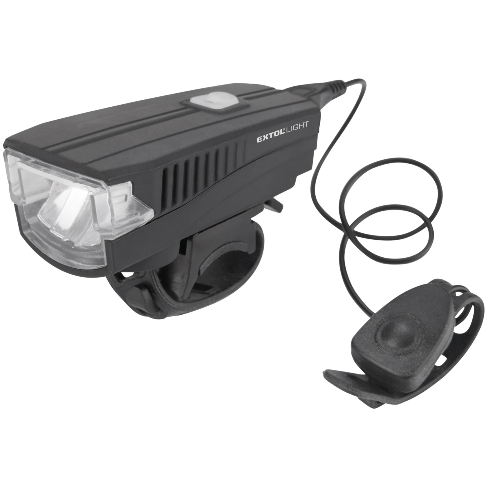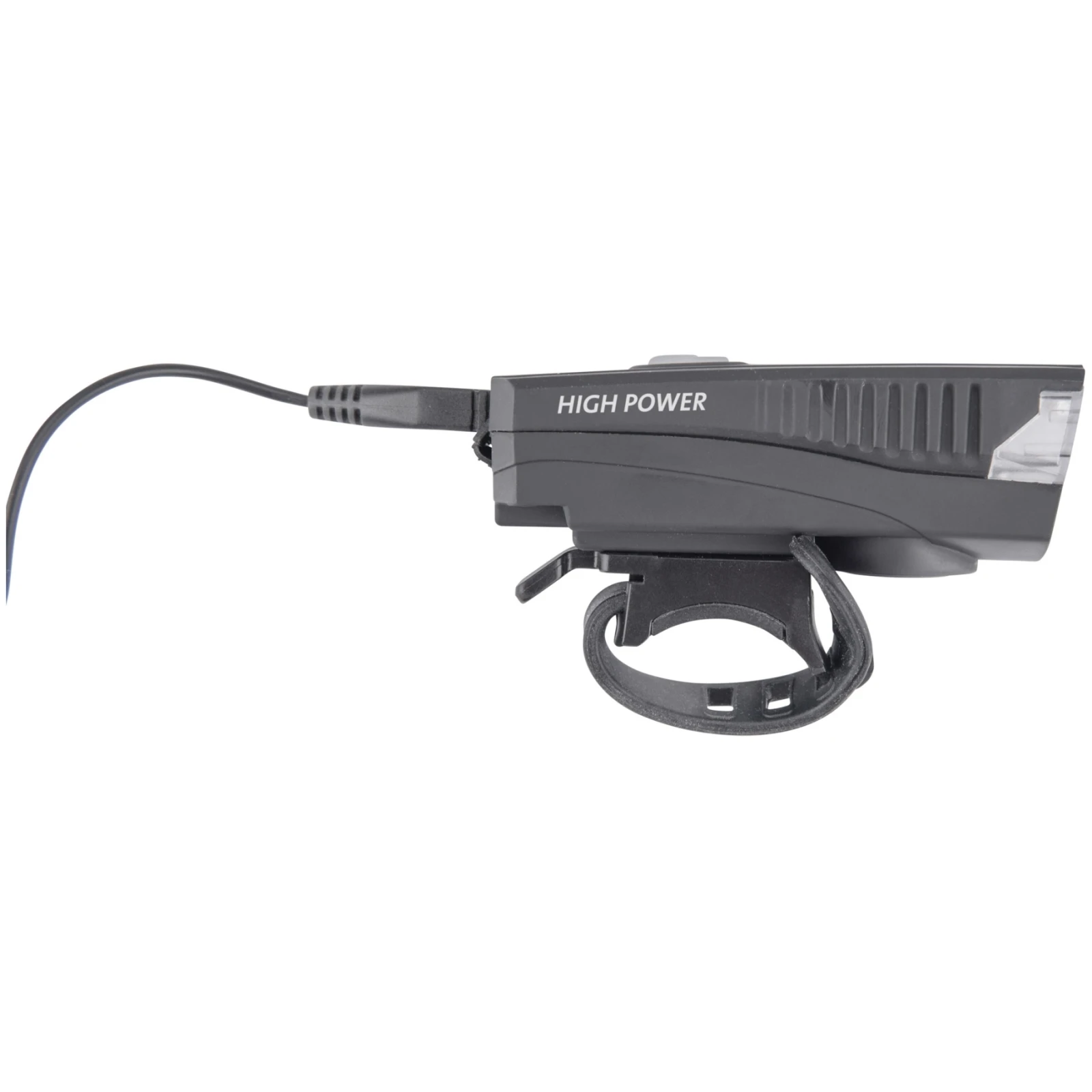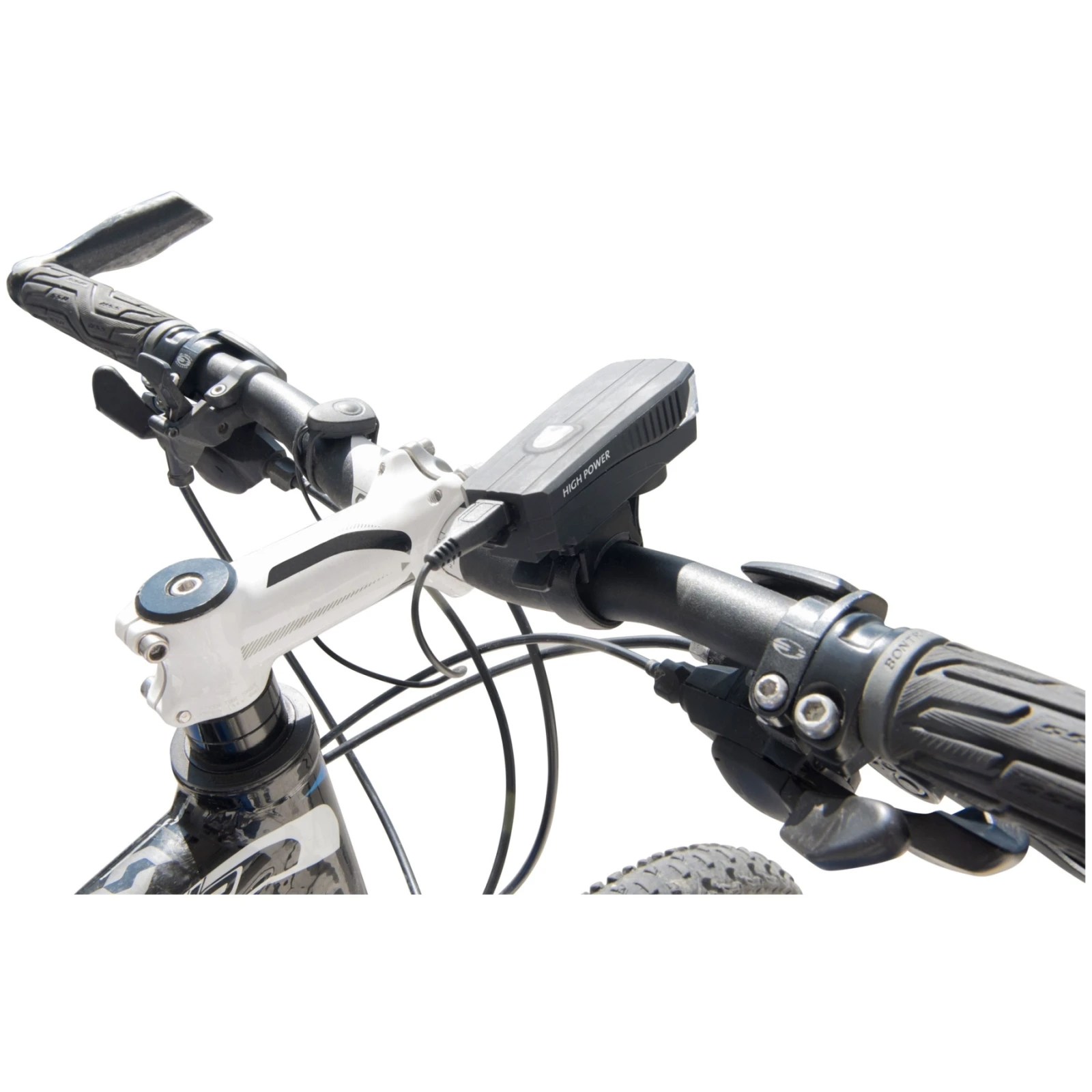 Wiederaufladbares Fahrrad-Frontlicht mit hoher Leistung von 350 Lumen und universeller Lenkerhalterung. Zusätzlich verfügt die Leuchte über eine Hupfunktion und lässt sich bequem mitnehmen.