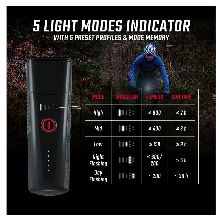 Das Buster 800 bietet 5 Beleuchtungsmodi, die bequem über voreingestellte Profile ausgewählt werden können. Das Licht wird weiterhin fesseln wiederaufladbarer Li-Ion-Akku, den Sie über das mitgelieferte USB-C-Kabel aufladen können, Batteriestatusanzeige, 360°-Halterung mit Schnellverschlusssystem , Memory-Funktion und erhöhte Widerstandsfähigkeit mit IPX4-Zertifizierung, die gewährleistet Schutz gegen Spritzwasser aus allen Richtungen. Somit können Sie das Licht auch bei schlechtem Wetter nutzen.