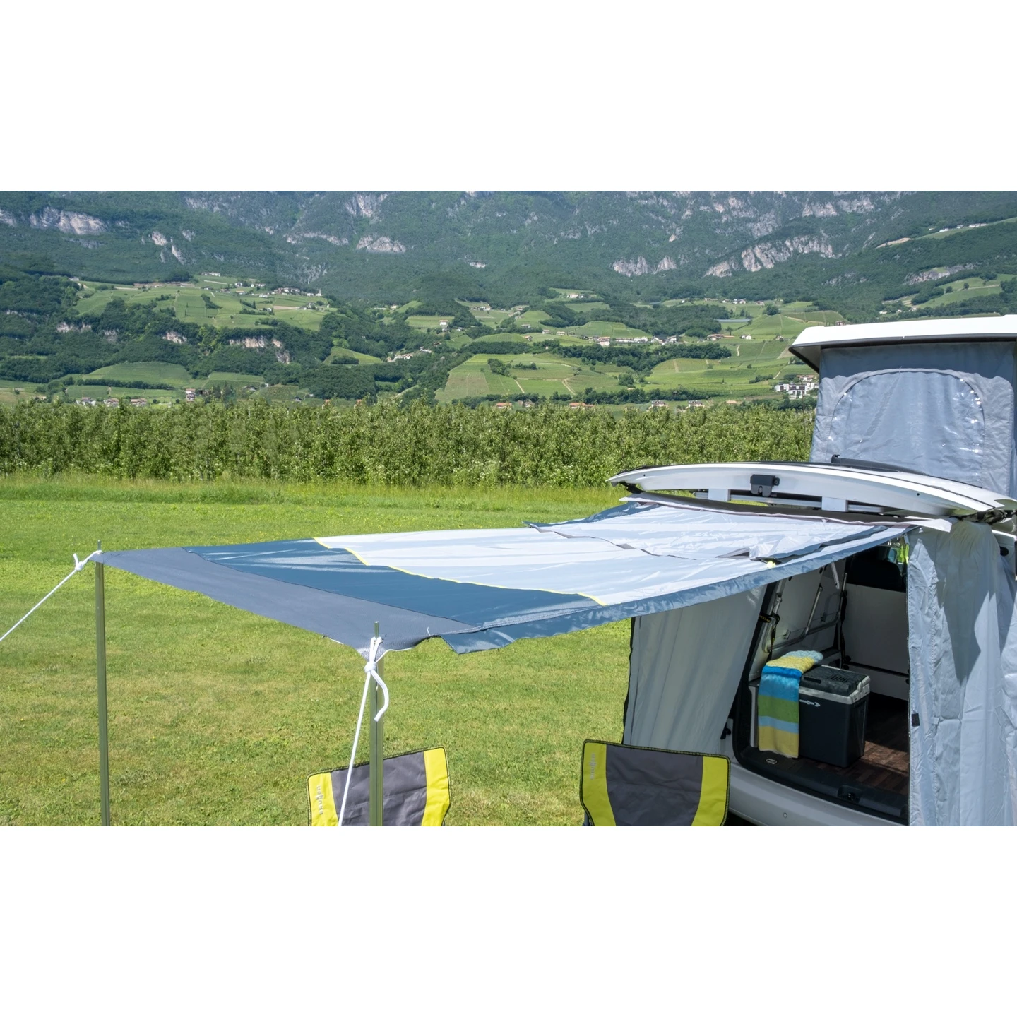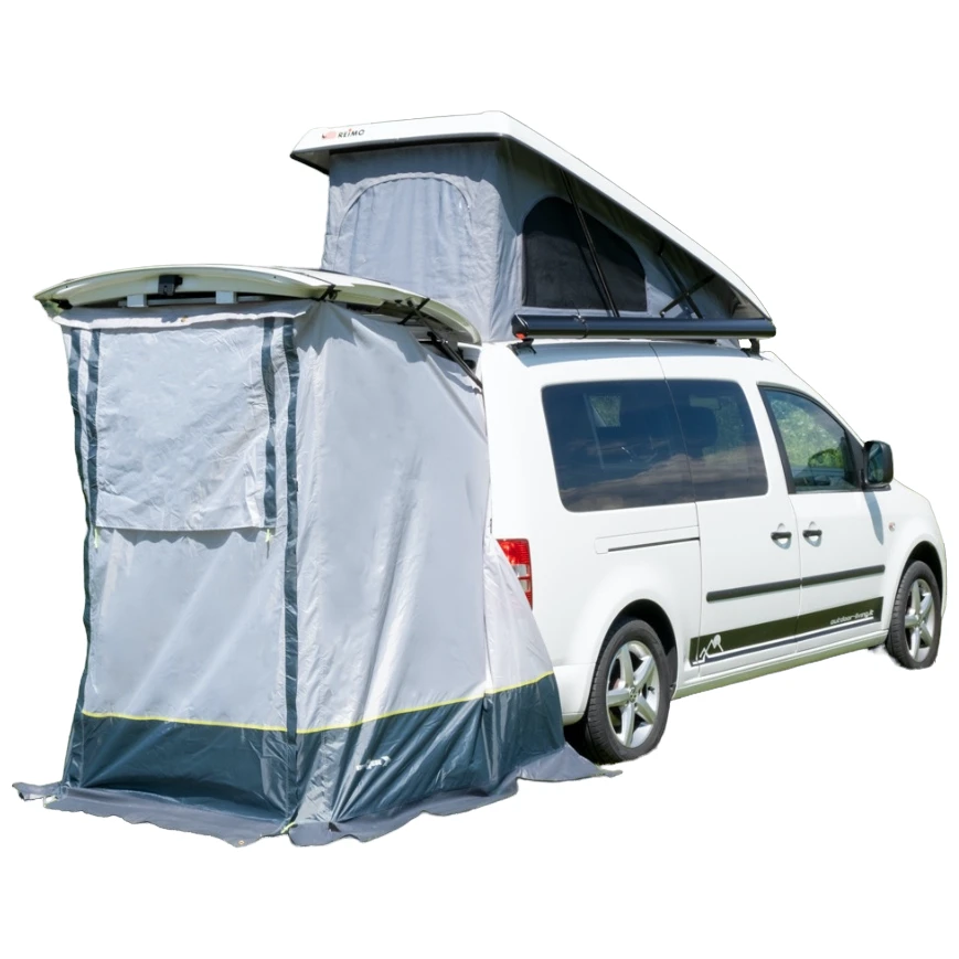 Pilote der Marke Brunner ist eine praktische und kompakte Markise, die den Platz Ihres Vans erweitert. Dieser Raum kann dann zum Kochen, zur Aufbewahrung von Sachen oder zum Abstellen von Fahrrädern genutzt werden. Der Hauptvorteil des Zeltes liegt in seiner Konstruktion, dank der Sie keine Stangen oder Stäbe benötigen. Hängen Sie einfach die Markise über die Hintertür und fertig. Die Befestigung am Auto erfolgt über ein Hakenset mit Gurten, die für einen festen Sitz sorgen.