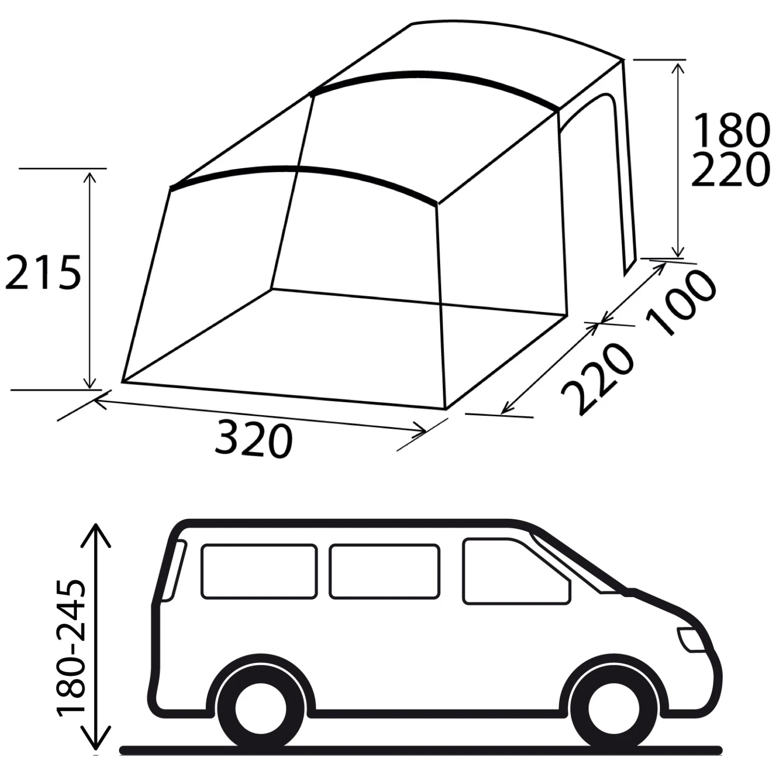 Als Einstieg steht Ihnen außerdem der praktische Seiteneingang zur Verfügung, den Sie mittels Stahlstangen (im Lieferumfang enthalten) in einen geräumigen Unterstand verwandeln können. Beide Eingänge verfügen über ein integriertes Moskitonetz. Für ausreichend Tageslicht sorgen große Fenster , die mit Vorhängen für mehr Privatsphäre ausgestattet sind. Weitere Vorteile des Zeltes sind ein fest eingenähter Polyethylenboden, ein Eingang für Elektrokabel, eine komplett verschließbare Zeltrückseite oder ein Eingang im Verbindungstunnel. Die Anbindung an das Fahrzeug erfolgt über eine 5/7 mm Zedernholzleiste, Tunnelleiste oder Dachreling. Im Lieferumfang ist außerdem eine praktische Tragetasche enthalten.