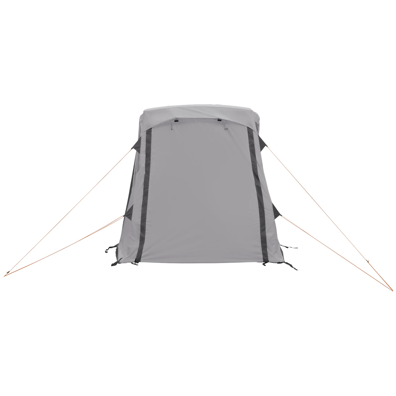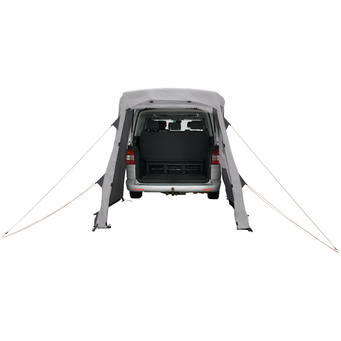 Der Aufbau ist sehr einfach. Über doppelte Spannseile verbindest Du das Zelt mit der Heckklappe. Sie können es entweder am Auto befestigen (sofern Sie Platz haben) oder einen Teil der Hülle über das Autodach werfen und die Kabel dahinter im Boden verankern.