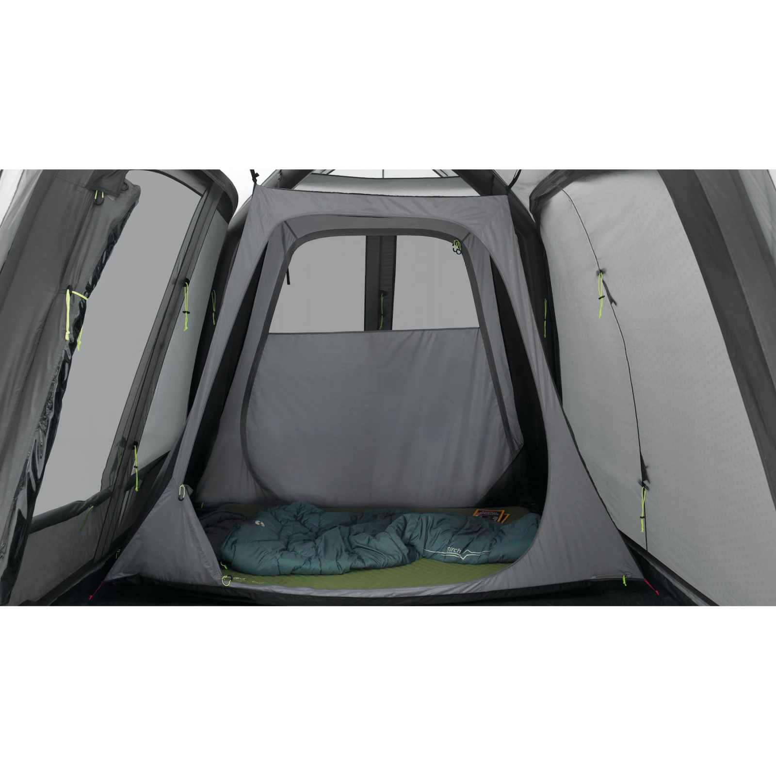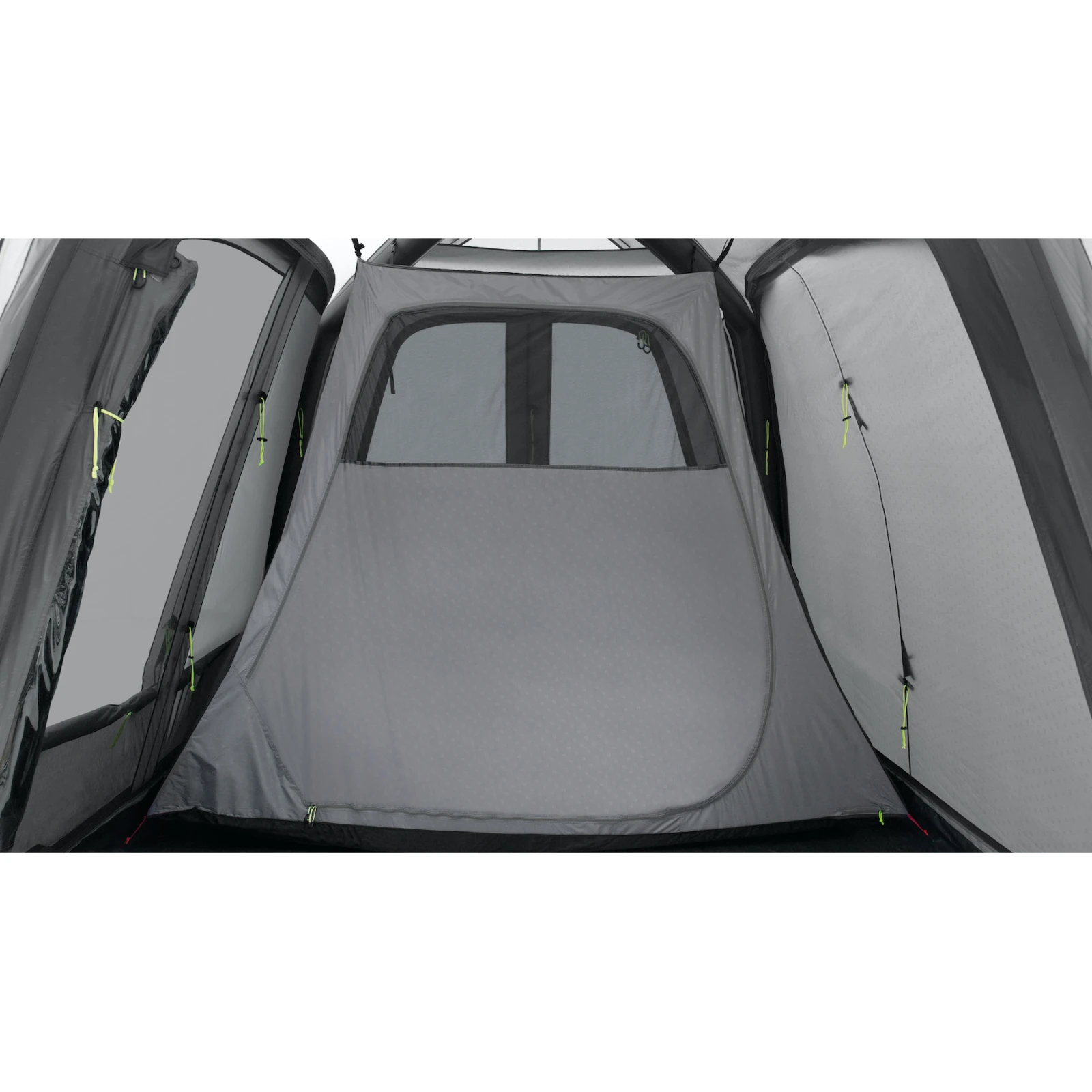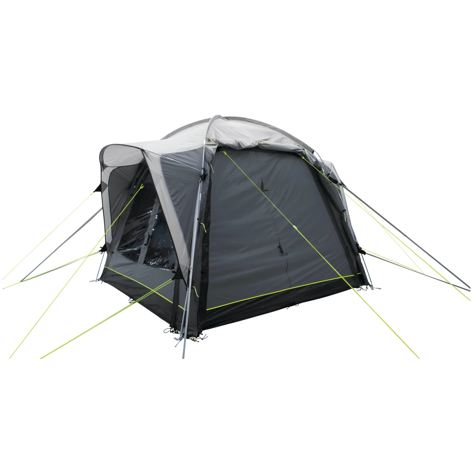 Zwei breite Haupteingänge mit Moskitonetzen ermöglichen einen hindernisfreien Zugang zum Zelt. Beide inGänge sind mit einem Baldachin überdacht,der verhindert, dass Regenwasser in das Zelt eindringt. Alternativ steht Ihnen auch der große Seiteneingang zur Verfügung, der sich komplett aufrollen lässt. Getönte Scheiben in den Türen sorgen für ausreichend Licht im Innenraum und schützen zugleich vor direkter Sonneneinstrahlung und UV-Strahlung. Für mehr Privatsphäre befestigen Sie den Vorhang einfach in der gewünschten Höhe am Fenster. Für eine gute Belüftung des Zeltinneren sorgt ein Belüftungssystem im Dach.