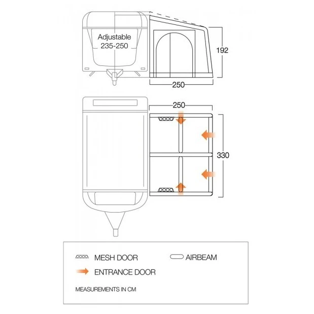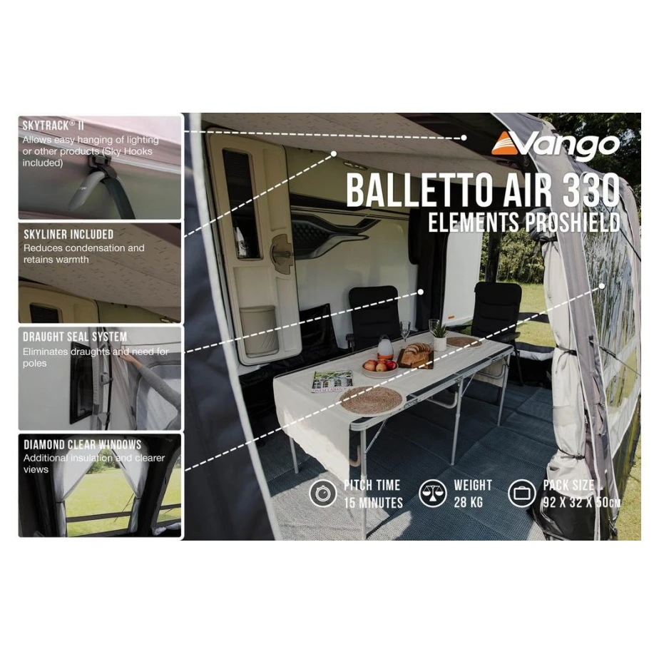 Das kompakte aufblasbare Vorzelt Balletto Air 330 Elements ProShield der Marke Vango ist eine ideale Wahl für Paare oder junge Familien, die mit dem Wohnwagen auf Abenteuerreise gehen. Es gibt zwei Seiteneingänge und zwei Vordereingänge, die zum Zelt führen. Die Eingänge sind zur Lüftung nutzbar und barrierefrei. Die Seiteneingänge sind dann mit Moskitonetzen ausgestattet. Selbstverständlich gehören auch Diamond Pro -Fenster mit Vorhängen zum Lieferumfang.