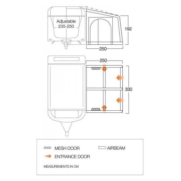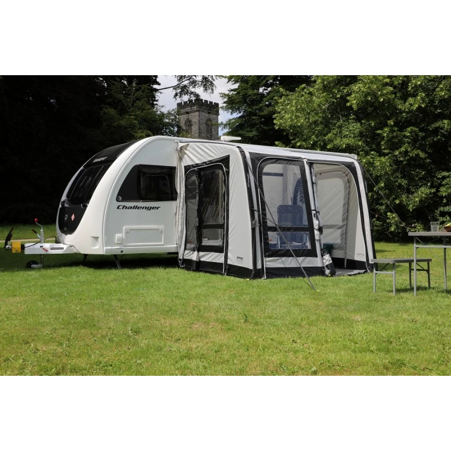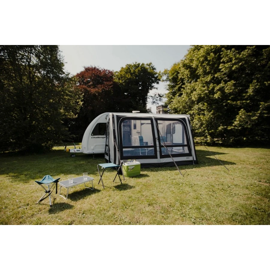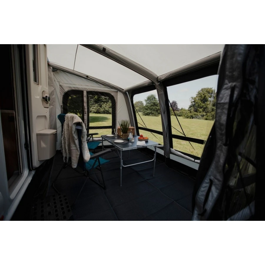 Das kompakte aufblasbare Vorzelt Balletto Air 330 der Marke Vango ist eine ideale Wahl für Paare oder junge Familien, die mit dem Wohnwagen auf Abenteuerreise gehen. Es gibt zwei Seiteneingänge und zwei Vordereingänge, die zum Zelt führen. Die Eingänge sind zur Lüftung nutzbar und barrierefrei. Die Seiteneingänge sind dann mit Moskitonetzen ausgestattet. Selbstverständlich gehören auch Diamond Clear -Fenster mit Vorhängen zum Lieferumfang.