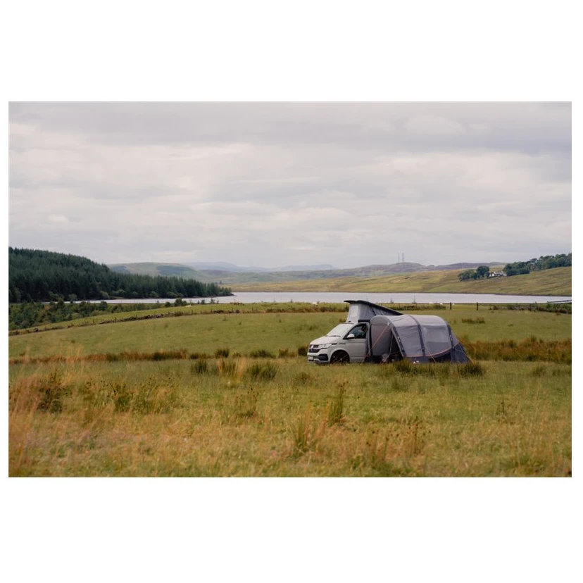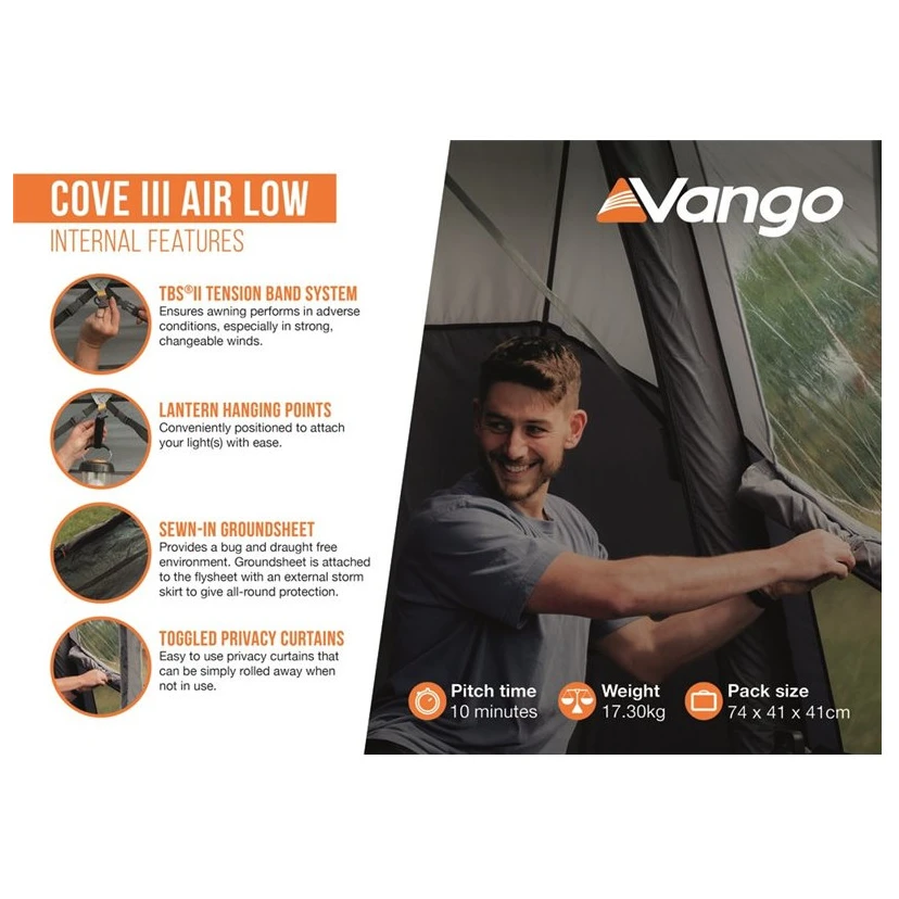 Das luxuriöse aufblasbare Vorzelt Cove III Air Low von Vango ist eine ideale Wahl für kürzere Autofahrten. Das Zelt lässt sich in 10 Minuten aufblasen, ist wasserdicht und geräumig.