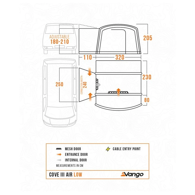 Das aufblasbare Vorzelt Cove III Air Low der Marke Vango ist eine ideale Wahl für alle, die mit ihrem Auto auf Abenteuer gehen und Platz zum Verstauen von Sachen oder zum Sitzen schaffen möchten. Sie können das Zelt ganz einfach am Auto befestigen und wieder abnehmen. So können Sie bei einem Ausflug durch die Gegend Ihr Zelt stehen lassen und es bei Ihrer Rückkehr ganz einfach wieder anbringen. Das Zelt verfügt über 3 Eingänge, über den vorderen barrierefreien Eingang mit Moskitonetz gelangt man in den Wohnbereich und über zwei in den Durchgang zwischen Zelt und Auto. Über dem Haupteingang befindet sich ein geräumiger Unterstand, der Schutz vor Sonne und Regen bietet. Für eine perfekte Tageslichtversorgung sorgen mehrere Diamond Clear -Fenster, die für mehr Privatsphäre mit Vorhängen ausgestattet sind.