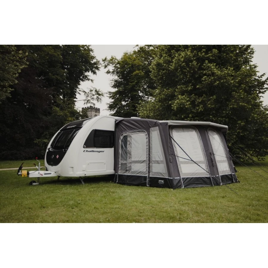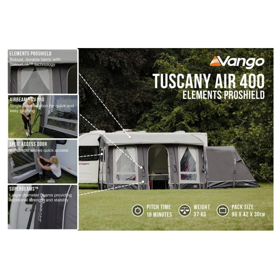 Das geräumige aufblasbare Vorzelt Tuscany Air 400 Elements ProShield der Marke Vango ist eine ideale Wahl für Paare oder junge Familien, die mit dem Wohnwagen auf Abenteuerreise gehen. Das Zelt verfügt über 2 Seiteneingänge und 3 Vordereingänge, die durch ein Vordach überdacht sind. Die Eingänge sind zur Lüftung nutzbar und barrierefrei. Die Seiteneingänge sind dann mit Moskitonetzen ausgestattet. Selbstverständlich gehören auch Diamond Pro -Fenster mit Vorhängen zum Lieferumfang.