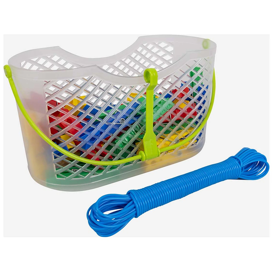 Der Korb hat einen Haken zum Aufhängen. Enthält 20 Wäscheklammern und eine 20 Meter lange Wäscheleine. Auch zu Hause im Garten kann eine Wäscheleine verwendet werden.