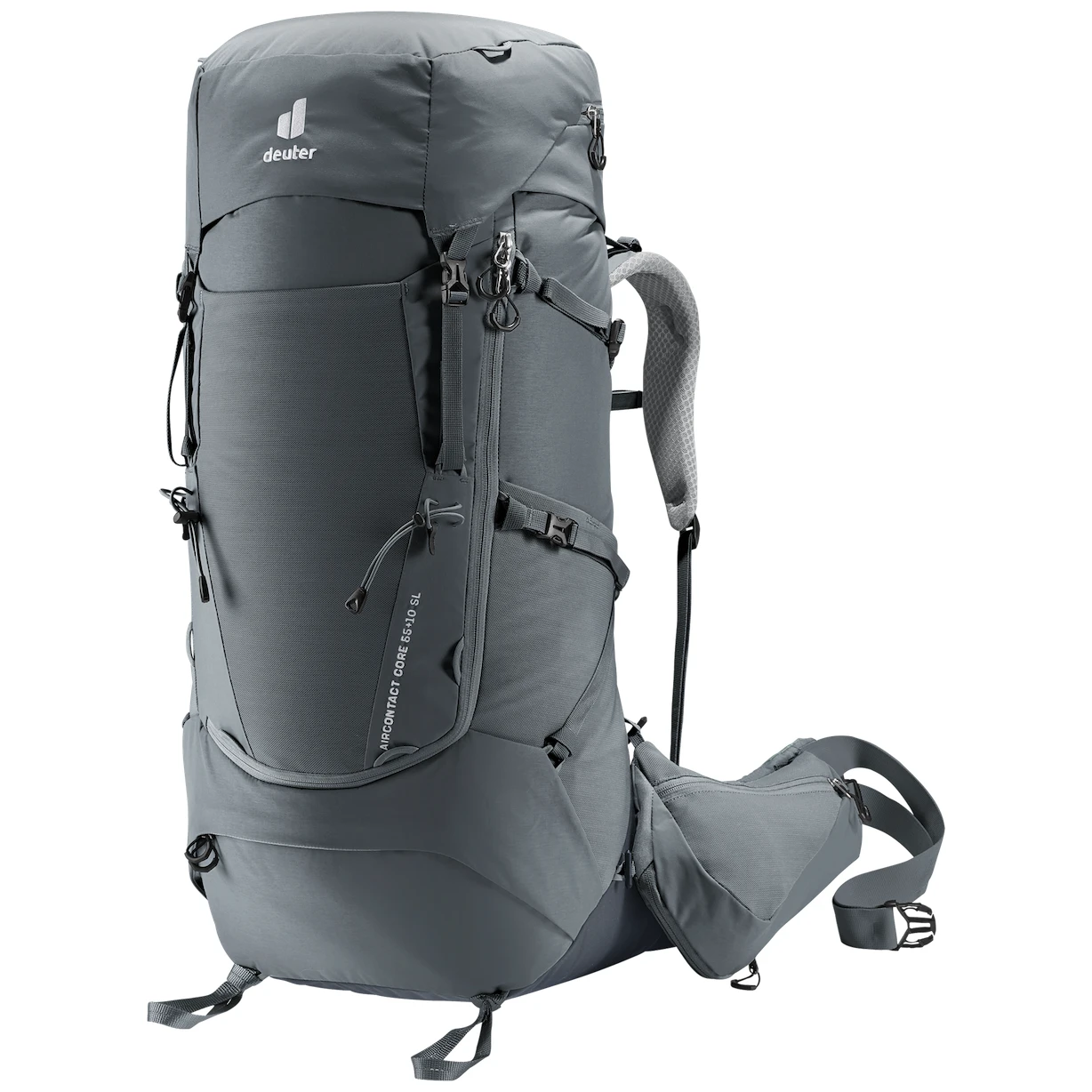 Dieser komfortable Wanderrucksack Aircontact Core 55+10 SL der Marke Deuter ist dank seiner modularen Gurte sehr vielseitig und kann je nach Tour oder mitzunehmender Ausrüstung so positioniert werden, dass unterschiedliche Gegenstände befestigt werden können. Seinen hohen Tragekomfort verdankt er dem Deuter Aircontact-Rückensystem mit Air Spacer-Mesh und großem Belüftungskanal sowie ergonomischen ActiveFit-Schultergurten und einem verstellbaren Brustgurt.