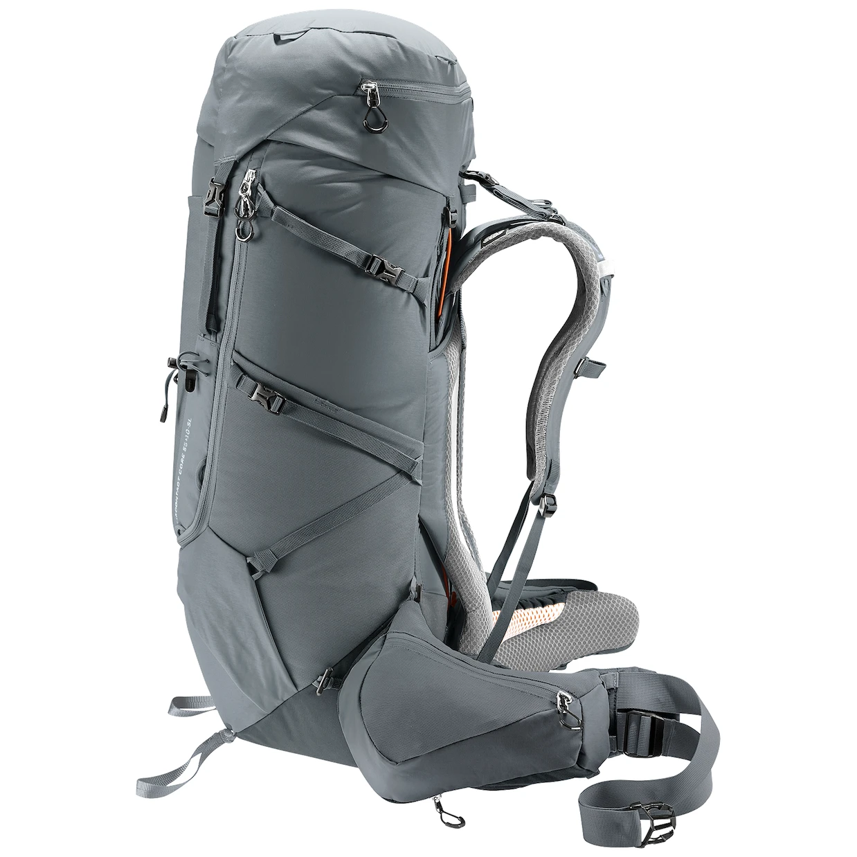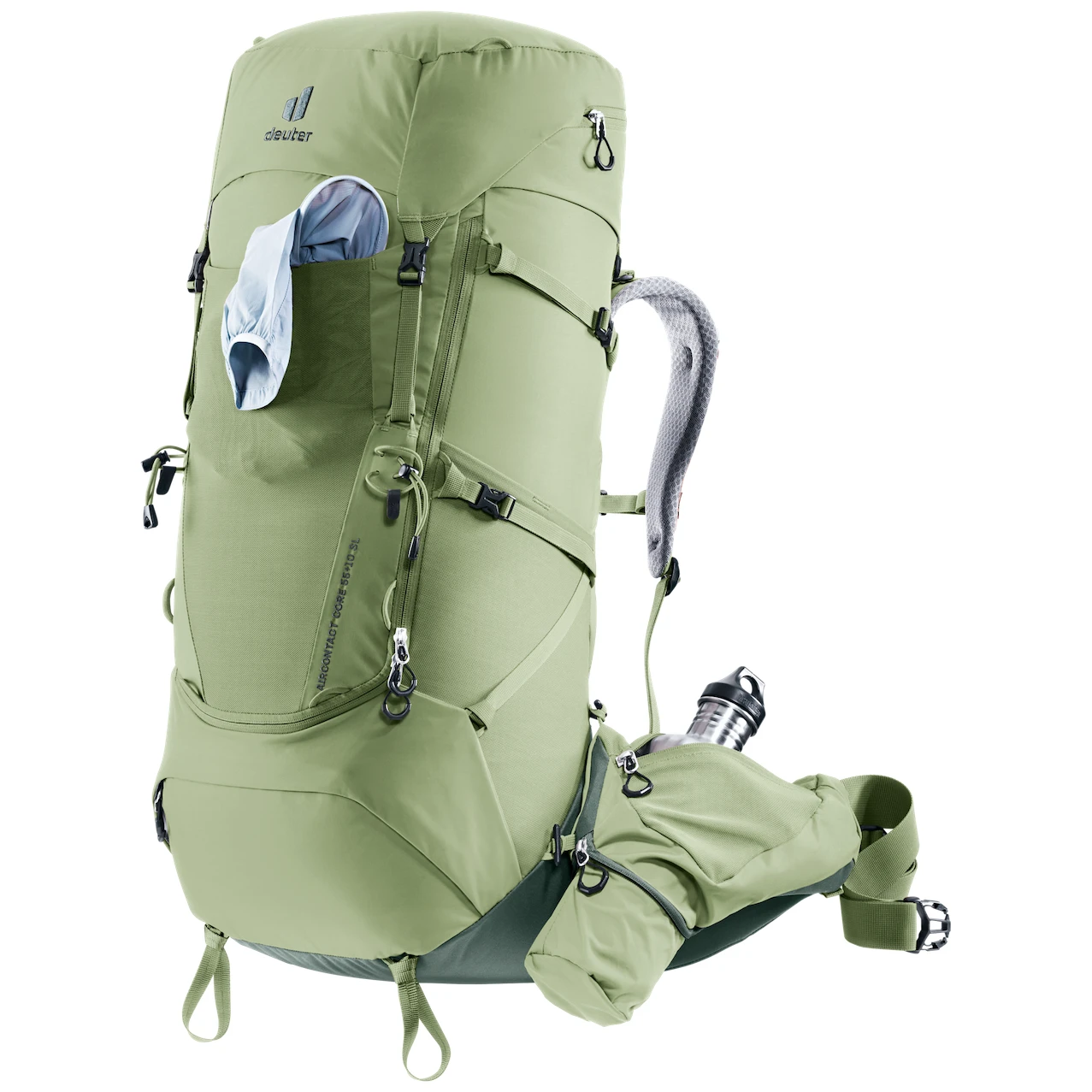 Der Y-förmige Rahmen in Kombination mit beweglichen Hüftgurten, die sich um die Hüfte legen und dem ergonomischen trapezförmigen Lendenpolster Deuter sorgen für eine effektive Verteilung und Stabilisierung der Last. Der durchgehende J-förmige Reißverschluss auf der Vorderseite erleichtert das Auffinden des Inhalts weiter unten im Hauptfach. Große, abnehmbare Hüftgurttaschen (3L) bieten zusätzlichen Stauraum und halten Gegenstände in Reichweite. Eine abnehmbare 1,5-Liter-Flaschenhalterung ermöglicht Ihnen außerdem, unterwegs Flüssigkeit zu sich zu nehmen. Das kürzere Rucksacknasensystem (SL) ist für Personen mit geringerer Körpergröße geeignet.