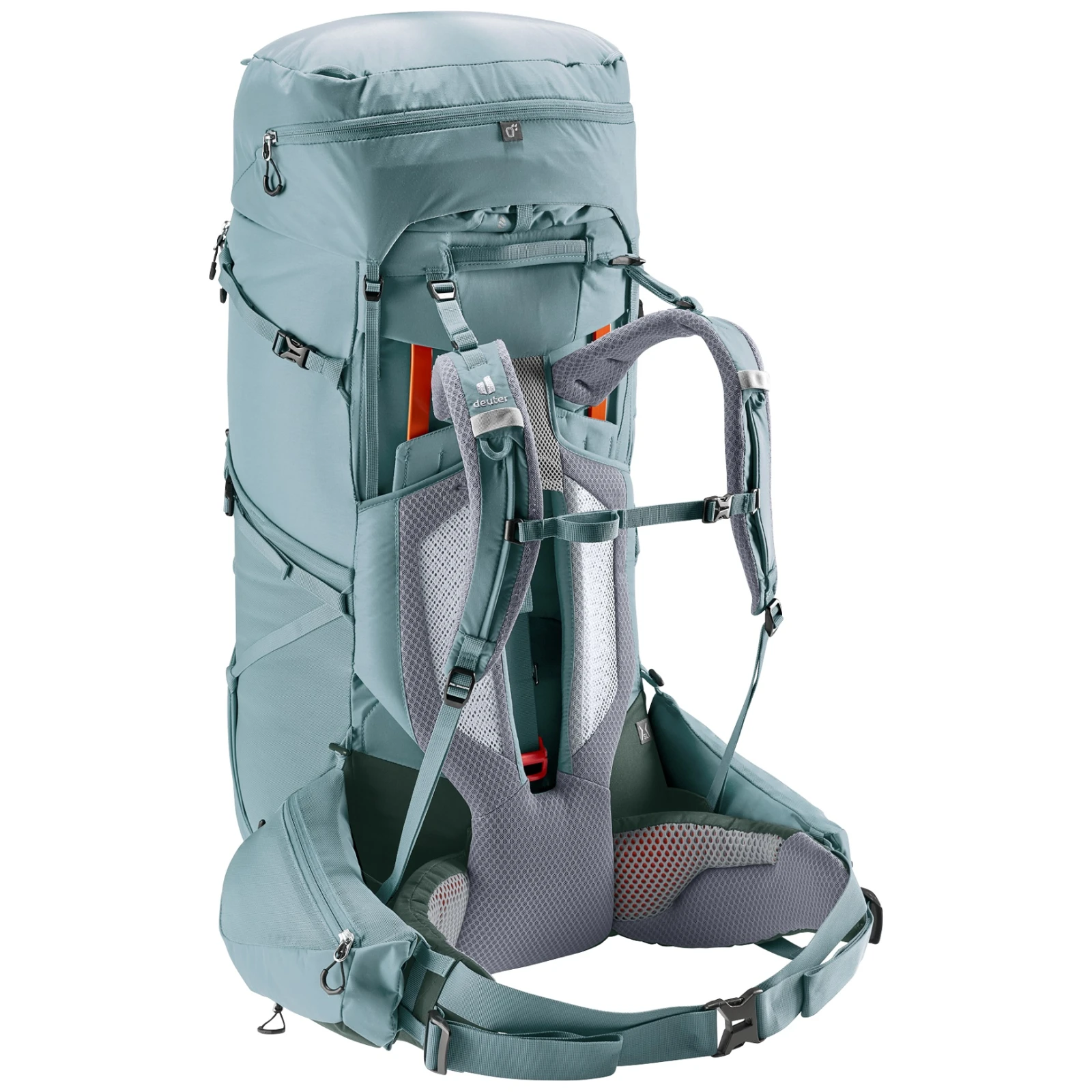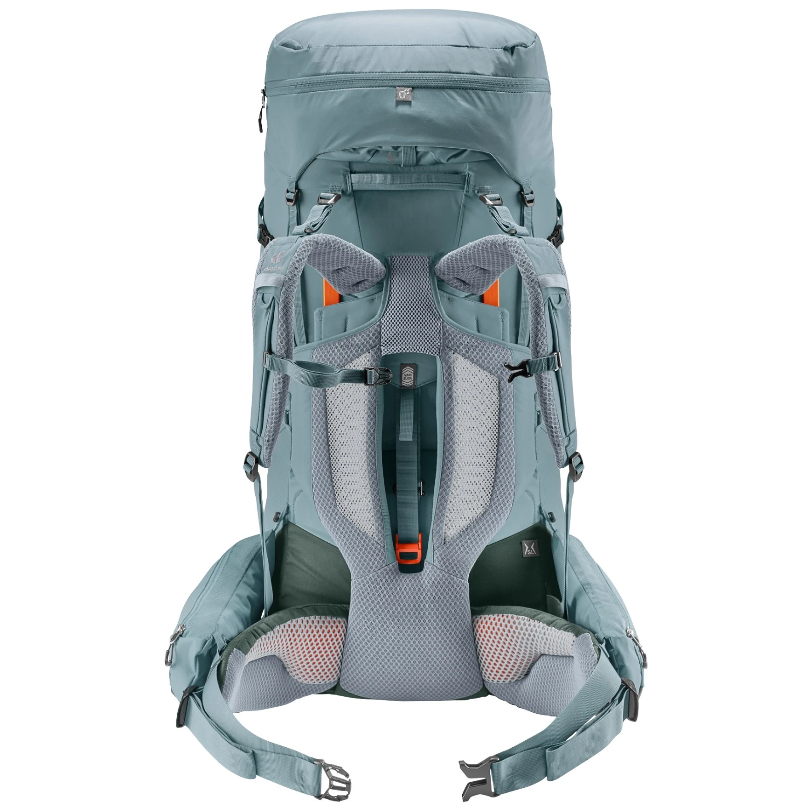 Dieser komfortable Wanderrucksack Aircontact Core 65+10 SL der Marke Deuter ist dank modularer Gurte, die sich je nach Tour oder mitzunehmender Ausrüstung so positionieren lassen, dass unterschiedliche Gegenstände befestigt werden können, äußerst vielseitig. Seinen hohen Tragekomfort verdankt er dem Deuter Aircontact-Rückensystem mit Air Spacer-Mesh und großem Belüftungskanal sowie ergonomischen ActiveFit-Schultergurten und einem verstellbaren Brustgurt. Der Y-förmige Rahmen in Kombination mit beweglichen Hüftgurten, die sich um die Hüfte legen und dem ergonomischen trapezförmigen Lendenpolster Deuter sorgen für eine effektive Verteilung und Stabilisierung der Last. Der durchgehende J-förmige Reißverschluss auf der Vorderseite erleichtert das Auffinden des Inhalts weiter unten im Hauptfach. Große, abnehmbare Hüftgurttaschen (3L) bieten zusätzlichen Stauraum und halten Gegenstände in Reichweite. Eine abnehmbare 1,5-Liter-Flaschenhalterung ermöglicht Ihnen außerdem, unterwegs Flüssigkeit zu sich zu nehmen. Das kürzere Rucksacknasensystem (SL) ist für Personen mit geringerer Körpergröße geeignet.