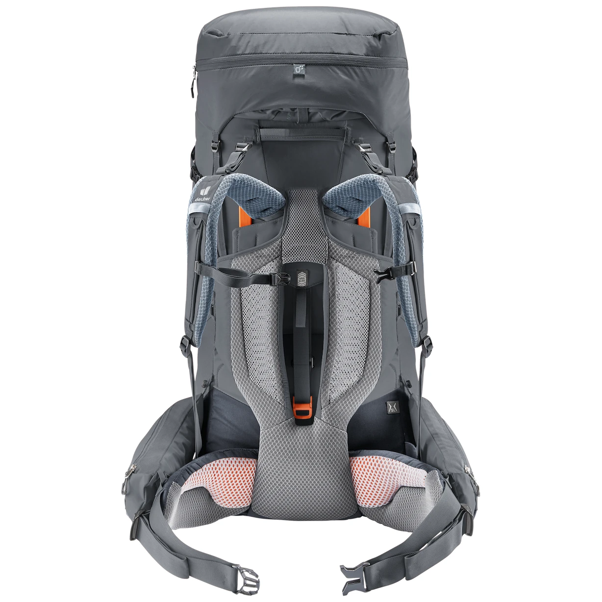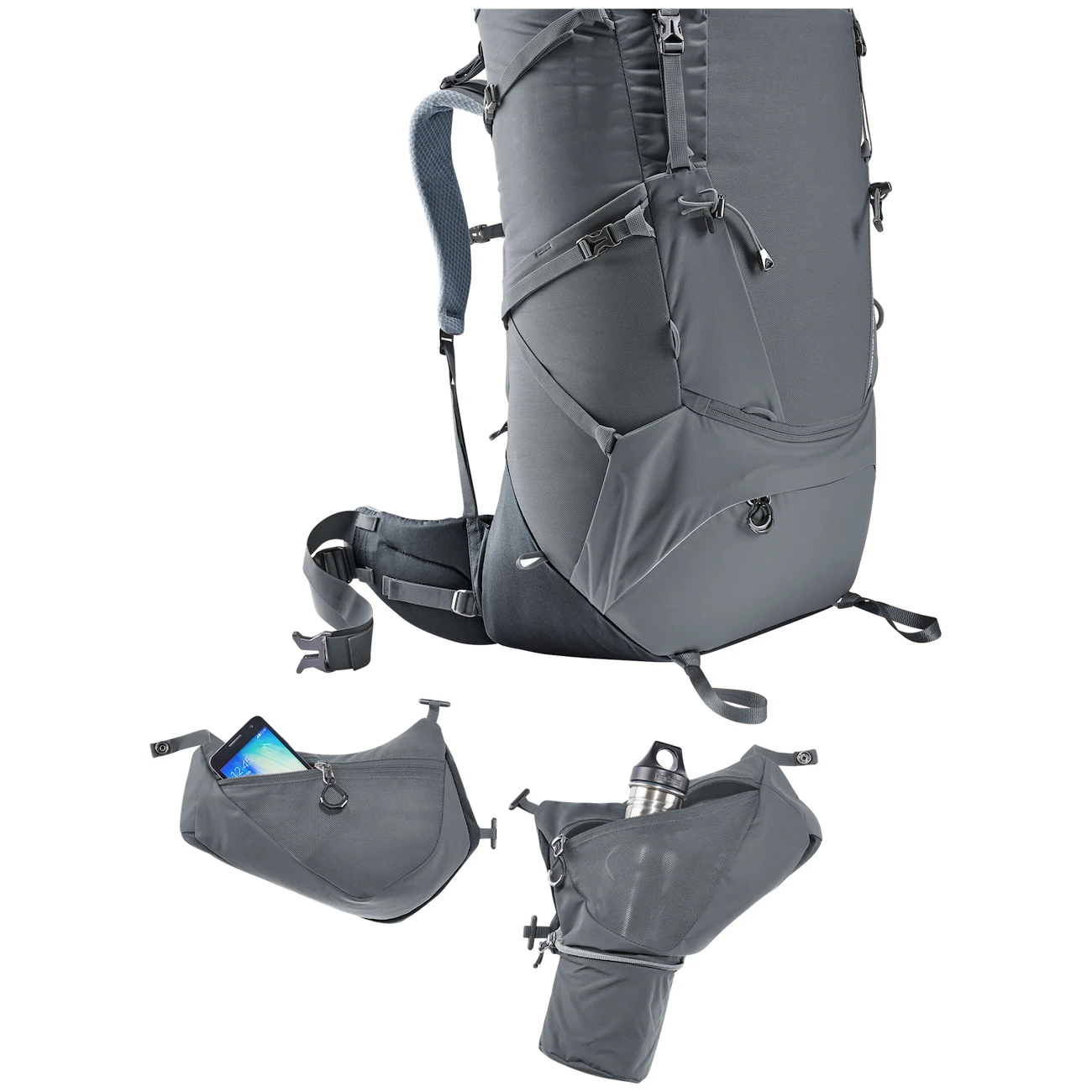 Der Y-förmige Rahmen in Kombination mit beweglichen Hüftgurten, die sich um die Hüfte legen und dem ergonomischen trapezförmigen Lendenpolster Deuter sorgen für eine effektive Verteilung und Stabilisierung der Last. Der durchgehende J-förmige Reißverschluss auf der Vorderseite erleichtert das Auffinden des Inhalts weiter unten im Hauptfach. Große, abnehmbare Hüftgurttaschen (3L) bieten zusätzlichen Stauraum und halten Gegenstände in Reichweite. Eine abnehmbare 1,5-Liter-Flaschenhalterung ermöglicht Ihnen außerdem, unterwegs Flüssigkeit zu sich zu nehmen. Das kürzere Rucksacknasensystem (SL) ist für Personen mit geringerer Körpergröße geeignet.