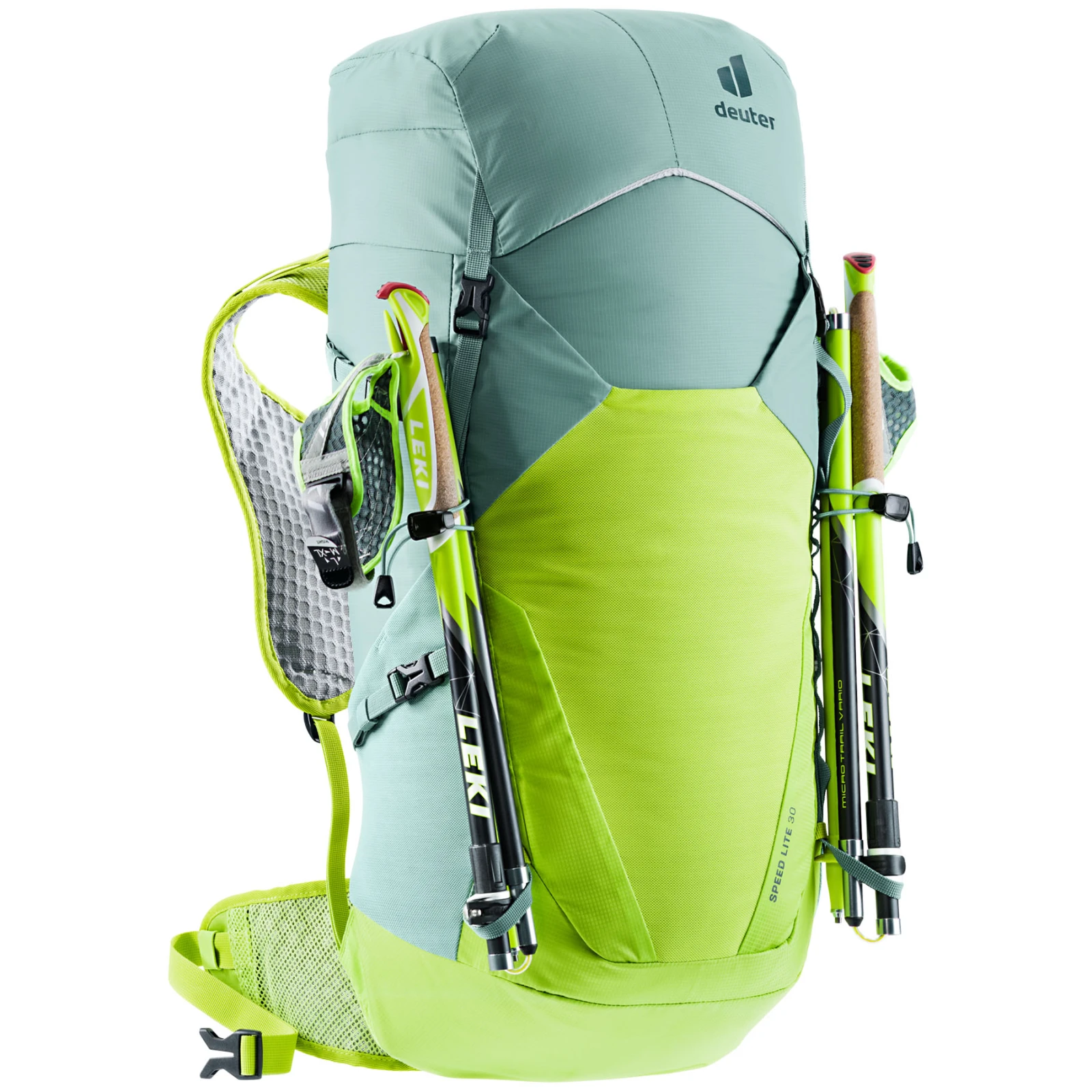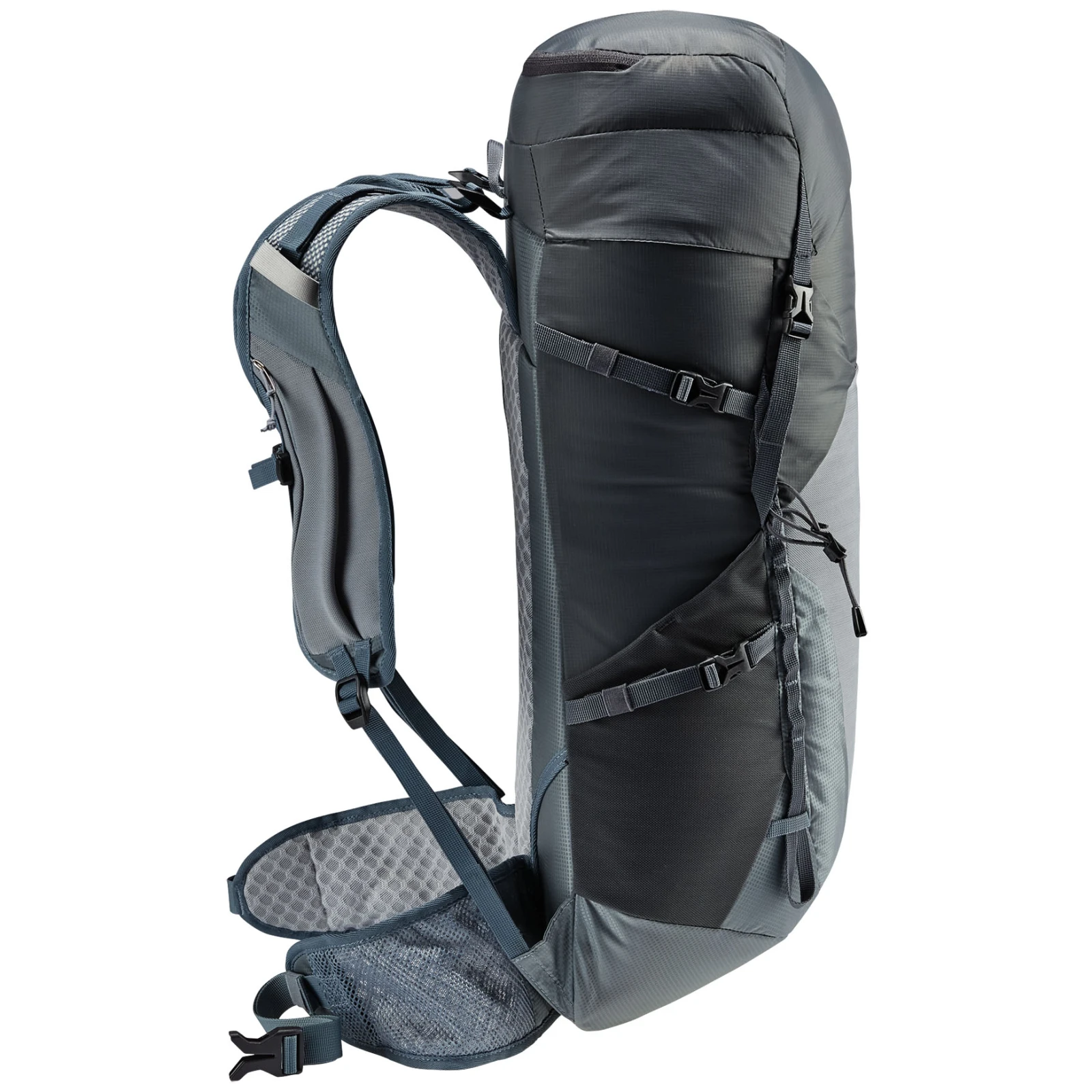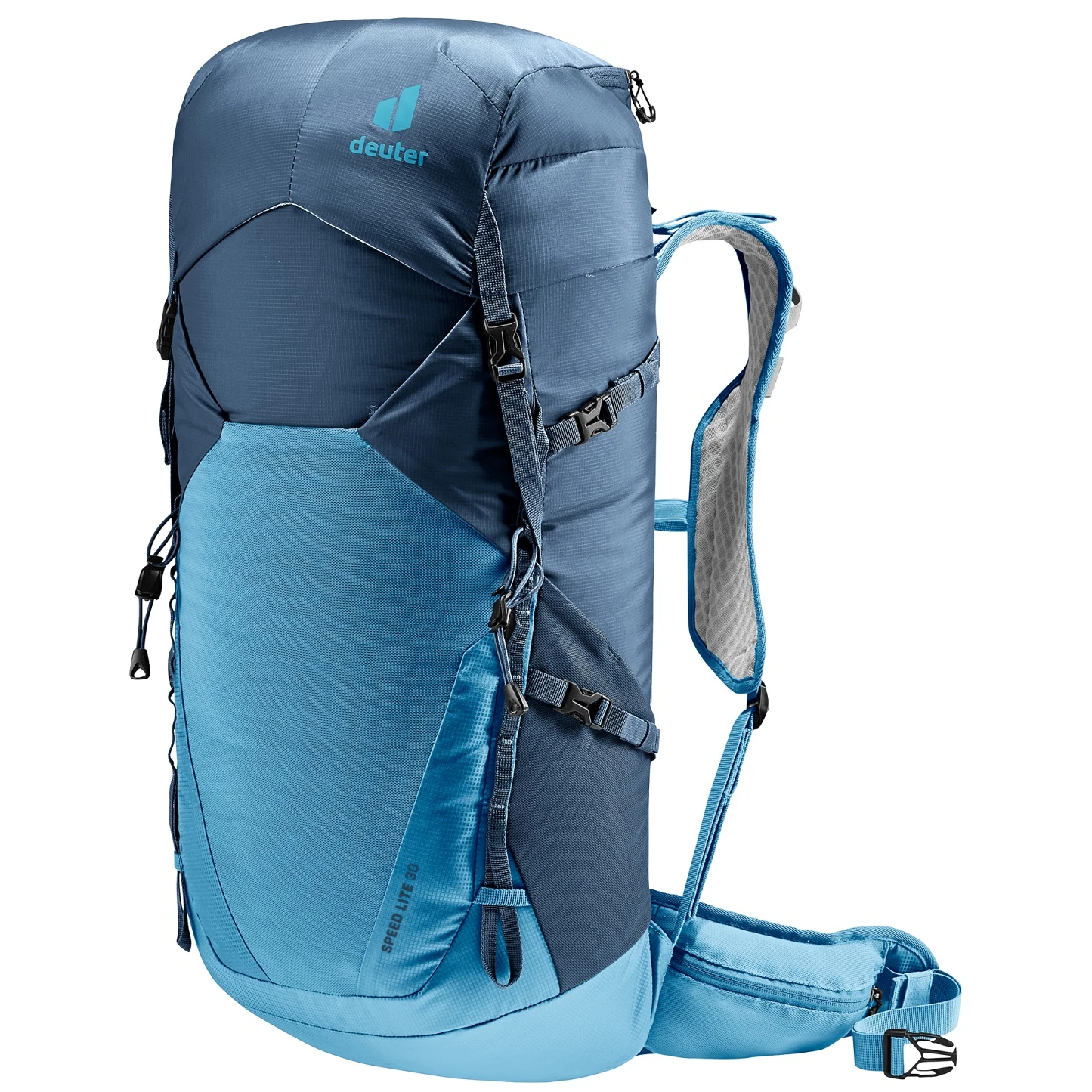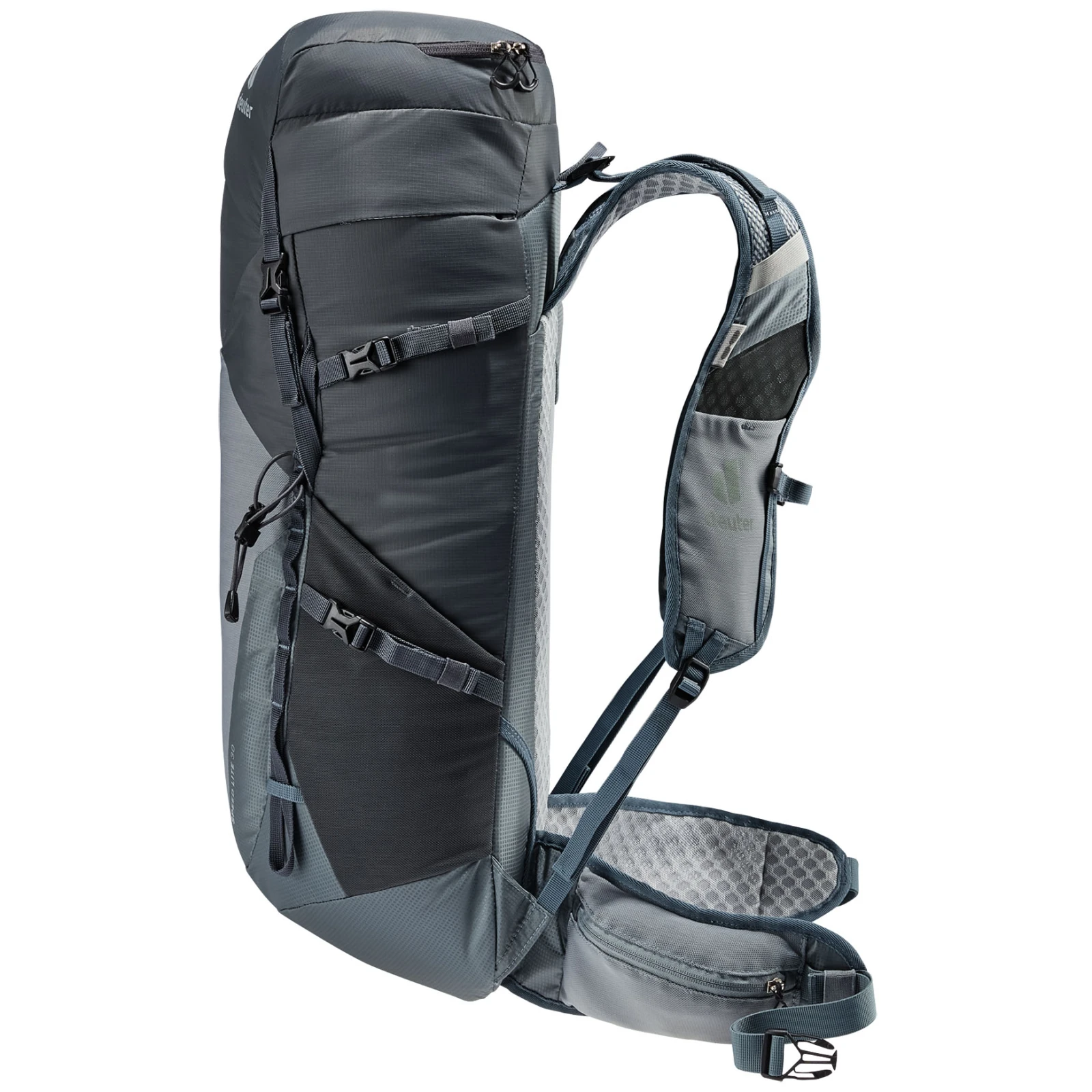 Wanderrucksack Deuter Speed Lite 30 eignet sich zum Wandern und Trailrunning. Der Rucksack ist leicht und nachhaltig dank des Deuter Lite-Rückensystems, perforierter Schultergurte, eines atmungsaktiven Hüftgurts, eines präzise verstellbaren Brustgurts und des zu 100 % recycelten, bluesign®-zertifizierten Körpergewebes. Der Rucksack verfügt außerdem über seitliche Kompressionsriemen, die für schnelles Wandern und Trailrunning konzipiert sind. Sie reduzieren effektiv das Schwanken der Last und ermöglichen volle Bewegungsfreiheit. In der Tasche an den Schultergurten lässt sich alles unterbringen, was man unterwegs braucht. Größere Gegenstände können Sie in der geräumigeren Tasche auf dem Deckel verstauen.