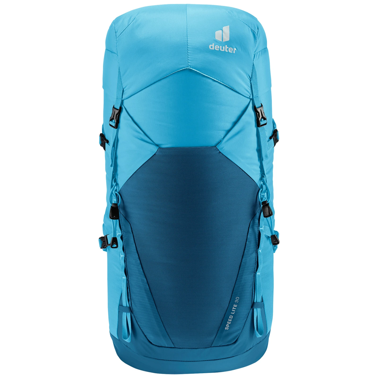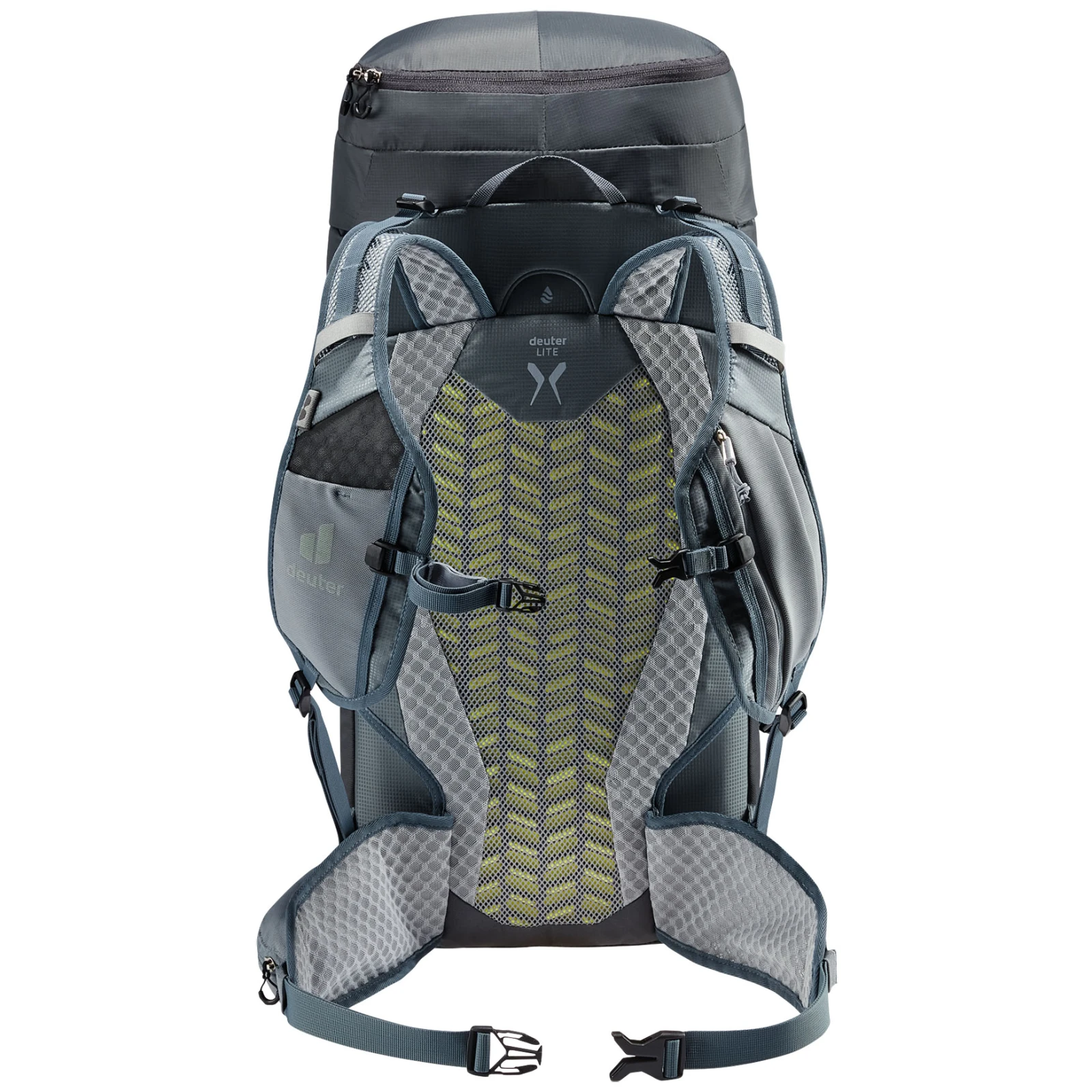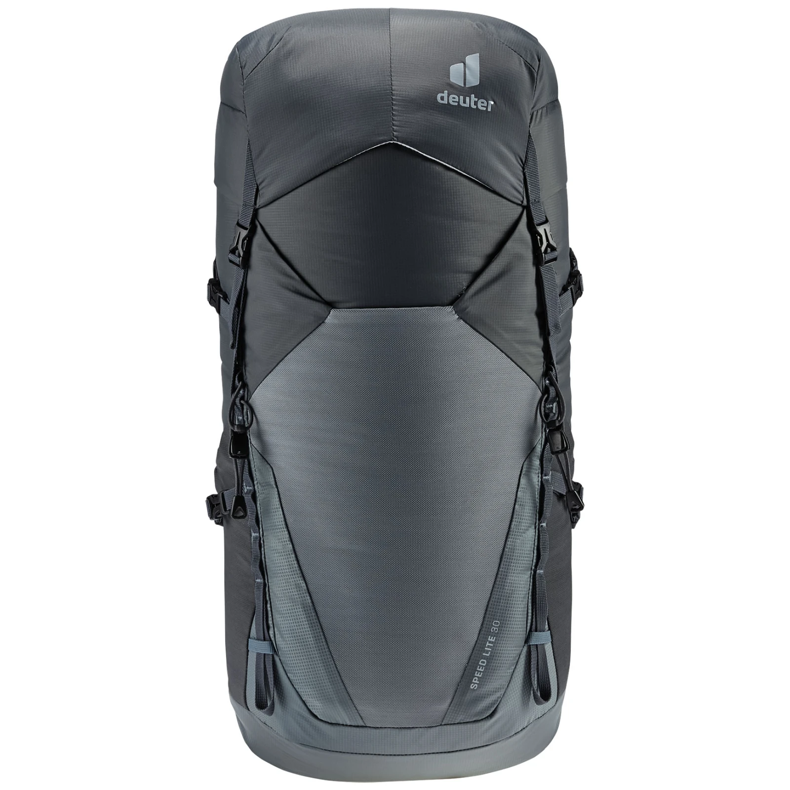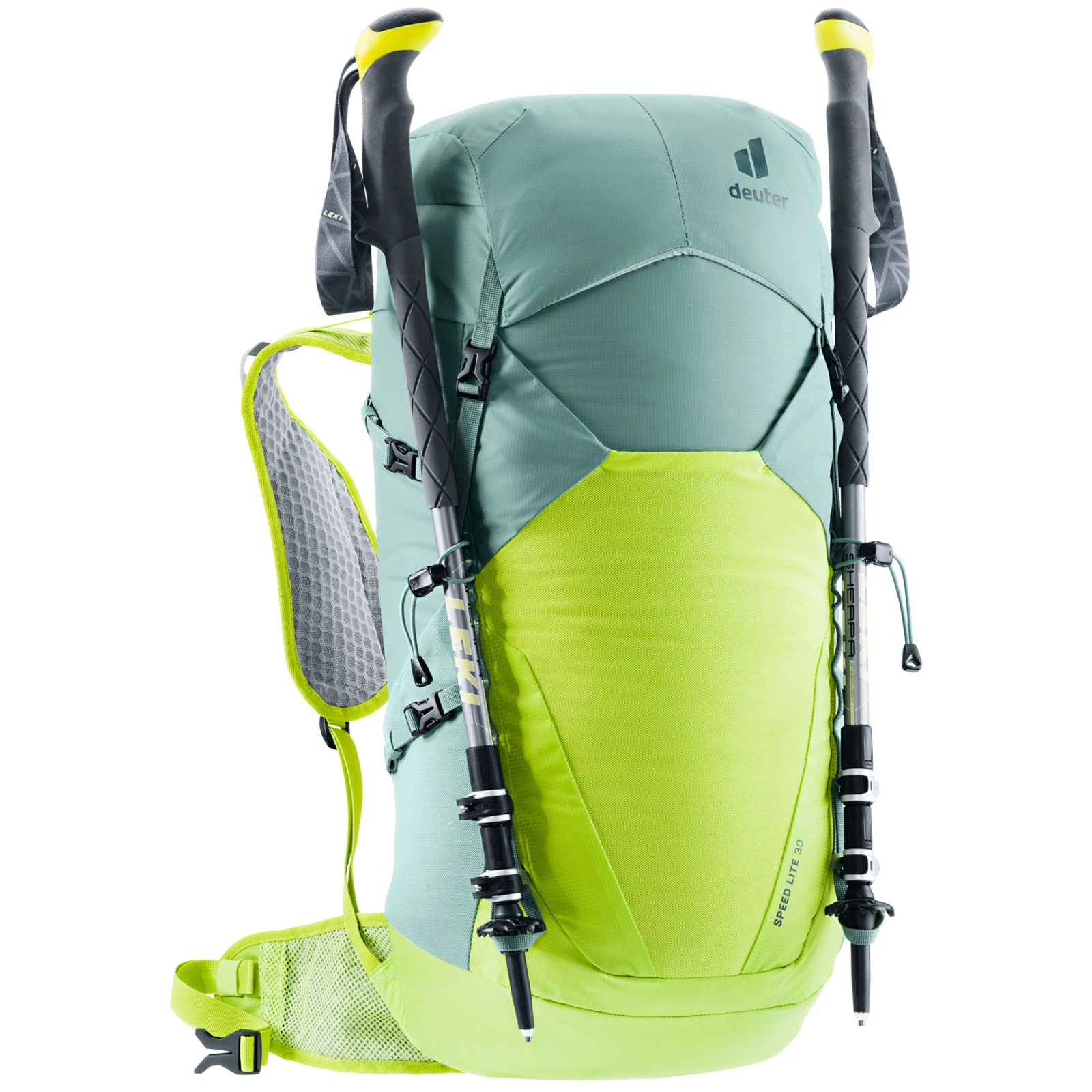 Wanderrucksack Deuter Speed Lite 30 eignet sich zum Wandern und Trailrunning. Der Rucksack ist leicht und nachhaltig dank des Deuter Lite-Rückensystems, perforierter Schultergurte, eines atmungsaktiven Hüftgurts, eines präzise verstellbaren Brustgurts und des zu 100 % recycelten, bluesign®-zertifizierten Körpergewebes. Der Rucksack verfügt außerdem über seitliche Kompressionsriemen, die für schnelles Wandern und Trailrunning konzipiert sind. Sie reduzieren effektiv das Schwanken der Last und ermöglichen volle Bewegungsfreiheit. In der Tasche an den Schultergurten lässt sich alles unterbringen, was man unterwegs braucht. Größere Gegenstände können Sie in der geräumigeren Tasche auf dem Deckel verstauen.