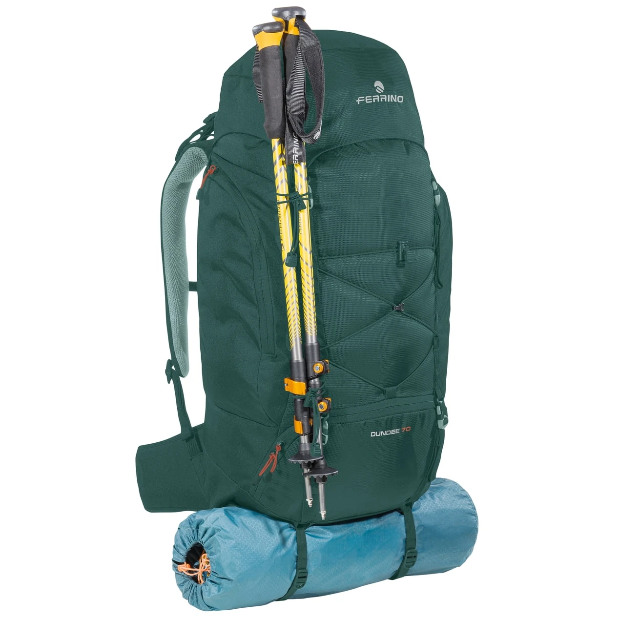 Der großvolumige Zweikammer-Wanderrucksack Dundee 70 vom Hersteller Ferrino mit 70 Liter Volumen und einer Innenaufteilung ist ein geeigneter Begleiter für Mehrtageswanderungen. Der Rucksack besteht aus den strapazierfähigen Polyestermaterialien Jacquard Weave 500D und Supertex®, die extrem langlebig, äußerst abrieb- und reißfest sind. Zudem sind Schlaufen zur Befestigung von Trekkingstöcken oder eines Eispickels vorhanden und es besteht die Möglichkeit, Ausrüstung außen am Rucksack zu befestigen.
