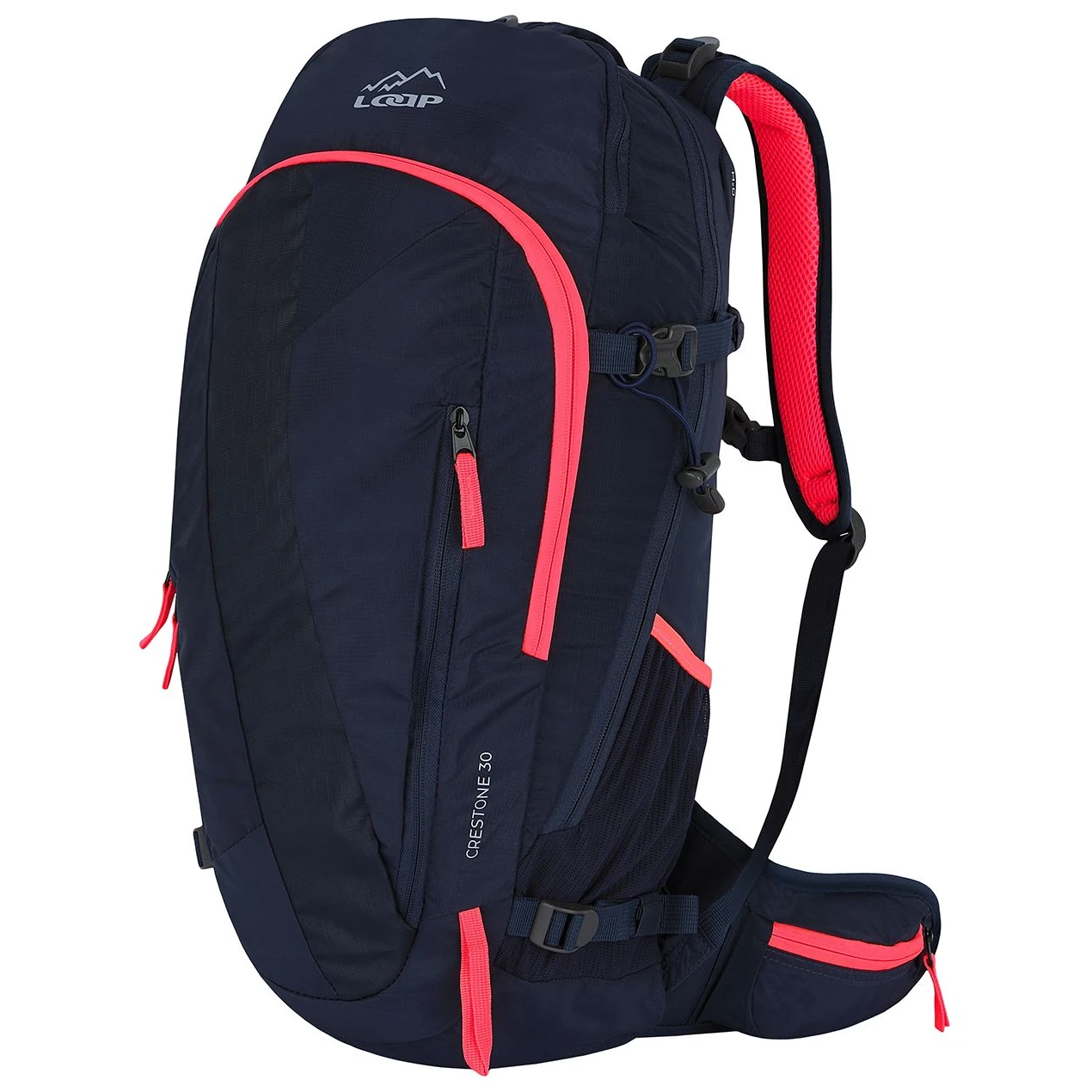 Der Wanderrucksack Crestone 30 von Loap mit integrierter Regenhülle verfügt über ein solides SBS-Rückensystem, das angenehmen Tragekomfort garantiert und den Inhalt zuverlässig schützt. Sehr strapazierfähiges und robustes Ripstop -Gewebe verhindert Verschleiß. Der Einkammer-Rucksack verfügt über einen mit einer Abdeckung ausgestatteten Hauptreißverschluss und wird von oben befüllt. Dir stehen fünf Außentaschen und eine Innentasche mit Platz für eine Trinkblase zur Verfügung. Die Schultergurte und der Hüftgurt sind anatomisch geformt. Seitliche Kompressionsgurte, ein verschiebbarer Brustgurt und Balancegurte entlasten zusätzlich Ihren Rücken. Der Rucksack enthält zusätzliche Ausrüstungshalterungen.