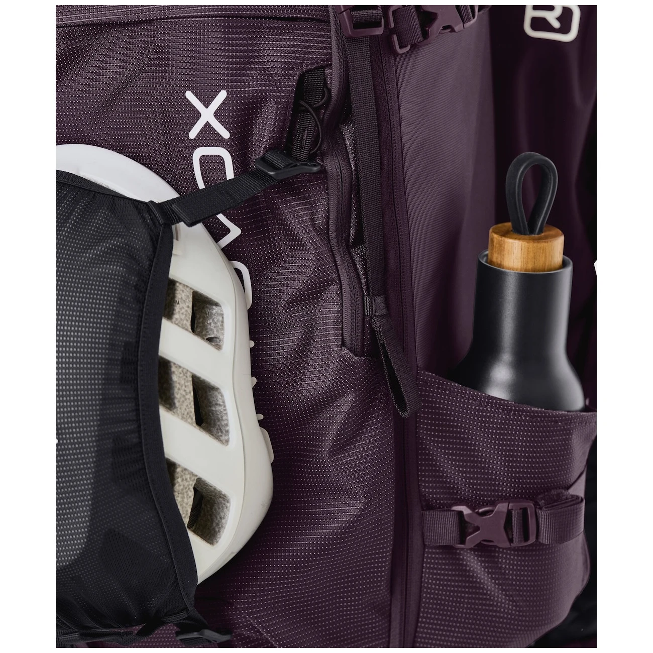 Der bequeme Zugriff auf die gesamte Hauptkammer erfolgt über einen umlaufenden Reißverschluss oder einen Kordelzugkragen unter dem oberen Deckel. Der helle Innenraum erleichtert die Orientierung im Inneren. Das clevere ausgefeilte Ausrüstungsklemmsystem ermöglicht die schnelle Befestigung von Seilen, Eispickeln, Skiern, Snowboards, Schneeschuhen, Helmen oder Stöcken. Der Rucksack verfügt über ein separates Sicherheitsfach, ein Kartenfach, eine Seitentasche, einen Flaschenhalter, eine Vorbereitung für eine Trinkblase und ein zusätzliches Fach für Notfallausrüstung. Selbstverständlich sind ein Brustgurt mit Signalpfeife und seitliche Kompressionsriemen vorhanden.