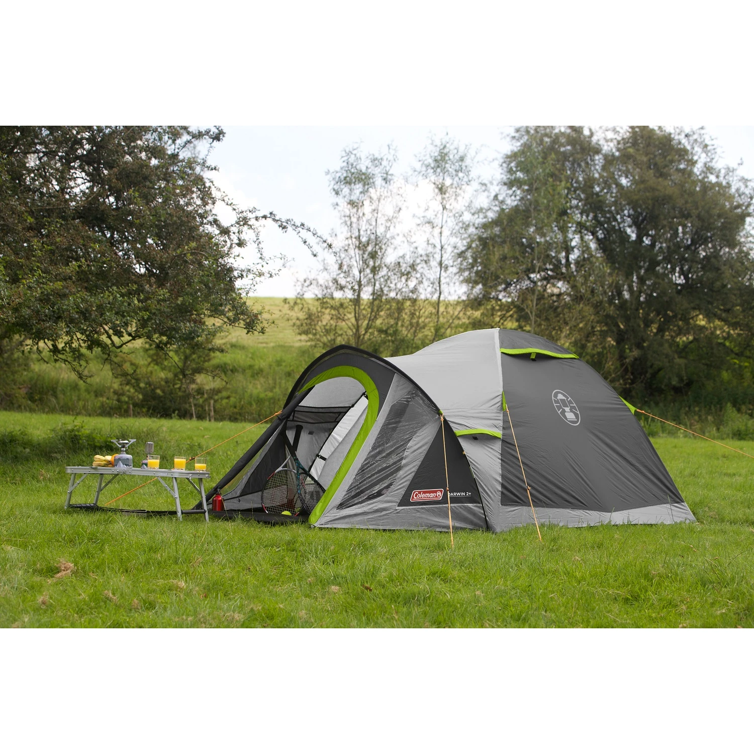 Das selbsttragende Touristenzelt Darwin 2+ der Marke Coleman verfügt über zwei gekreuzte Stangen, die eine Schlafkabine bilden. Durch die dritte ausgefahrene Stange entsteht ein großzügiger Flur mit integriertem Boden. Darwin 2+ verfügt über einen geräumigen Vorraum, der sich ideal zum Verstauen von Gepäck oder Schuhen eignet. Das Zelt bietet bequem für ein bis zwei Übernachtungen und ein tolles Preis-Leistungs-Verhältnis.
