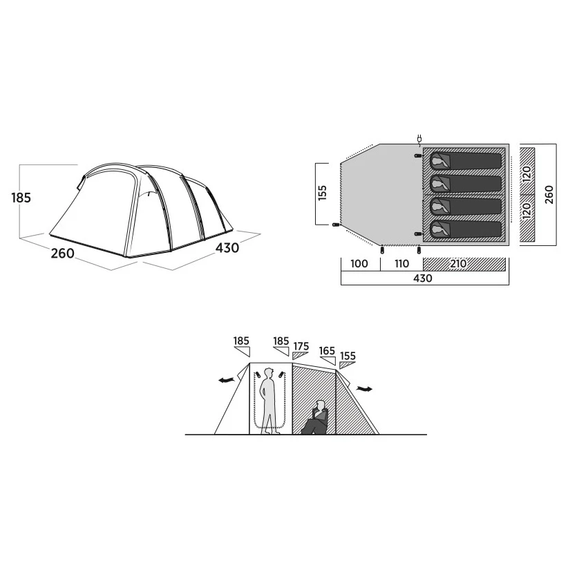 Das Zelt verfügt über einen Vorraum mit festem Boden und großem Fenster, der Platz zur Aufbewahrung von Gegenständen und für den normalen Gebrauch bietet. Wenn Sie mehr Privatsphäre wünschen, kann das Fenster geschlossen werden. Zusätzliche Seitentüren mit Moskitonetzen ermöglichen eine bessere Luftzirkulation und flexiblen Zugang ins Zeltinnere. Ausreichende Höhe der Wohnfläche ermöglicht aufrechte Bewegungen. Im Inneren erwartet Sie ein verdunkelbares Schlafzimmer SleepTight, das auch tagsüber für ungestörten Schlaf sorgt. Das Schlafzimmer kann durch eine Trennwand in zwei Teile unterteilt werden.