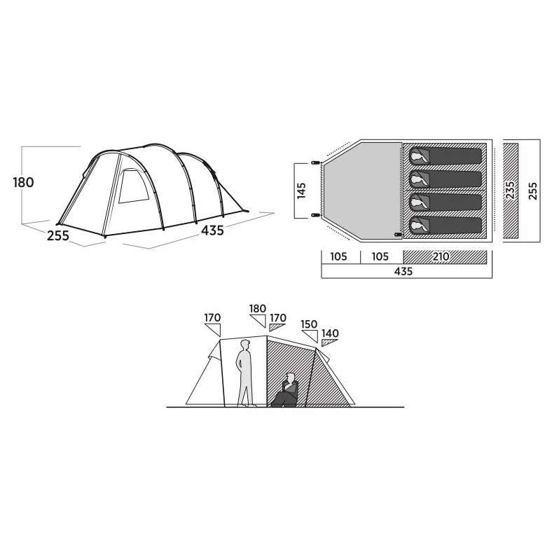 Es wird vor allem bei Familienzelten verwendet, bei denen der Schwerpunkt auf nutzbarem Raum und Komfort liegt. Mehr Schlafzimmer bedeuten mehr Privatsphäre und mehr Vielfalt im Innenraum.