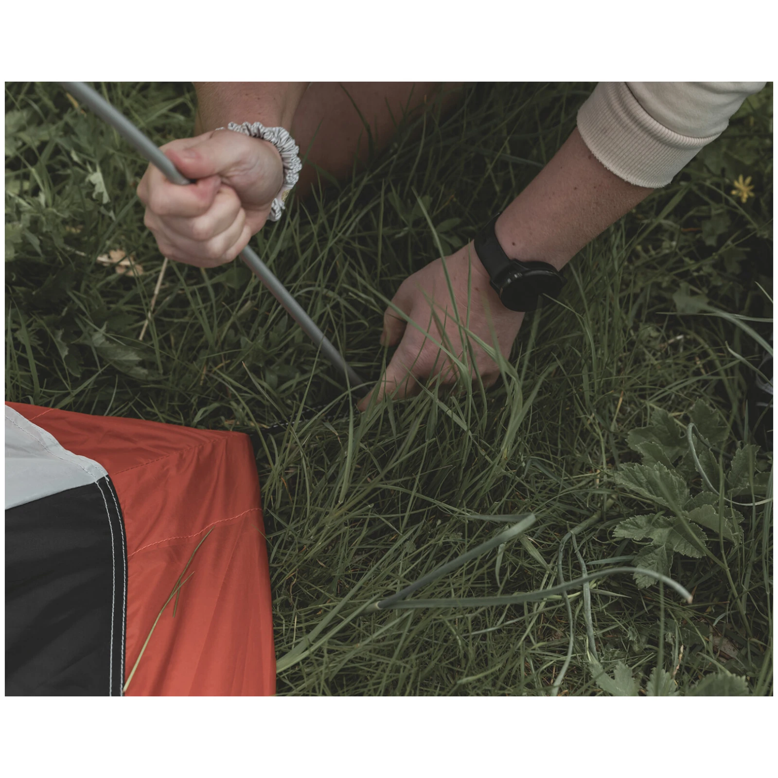 Das Zelt verfügt über eine kleine Vorhalle ohne Boden, die Platz zum Verstauen von Sachen bietet. Im Inneren finden Sie einen Haken, an dem Sie Ausrüstungsgegenständeaufhängen können, beispielsweise Fahrradhelme oder Wäscheleinen. Für kleine Gegenstände, die Sie immer griffbereit haben möchten, gibt es im Schlafzimmer eine Netztasche.