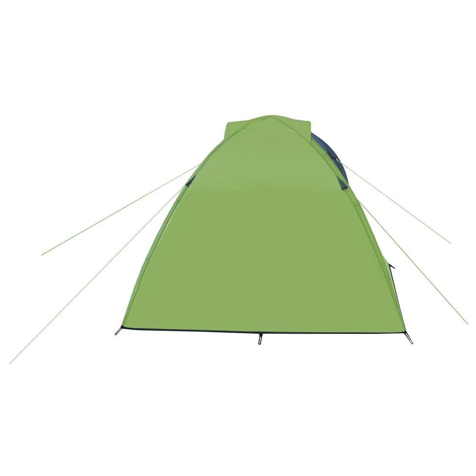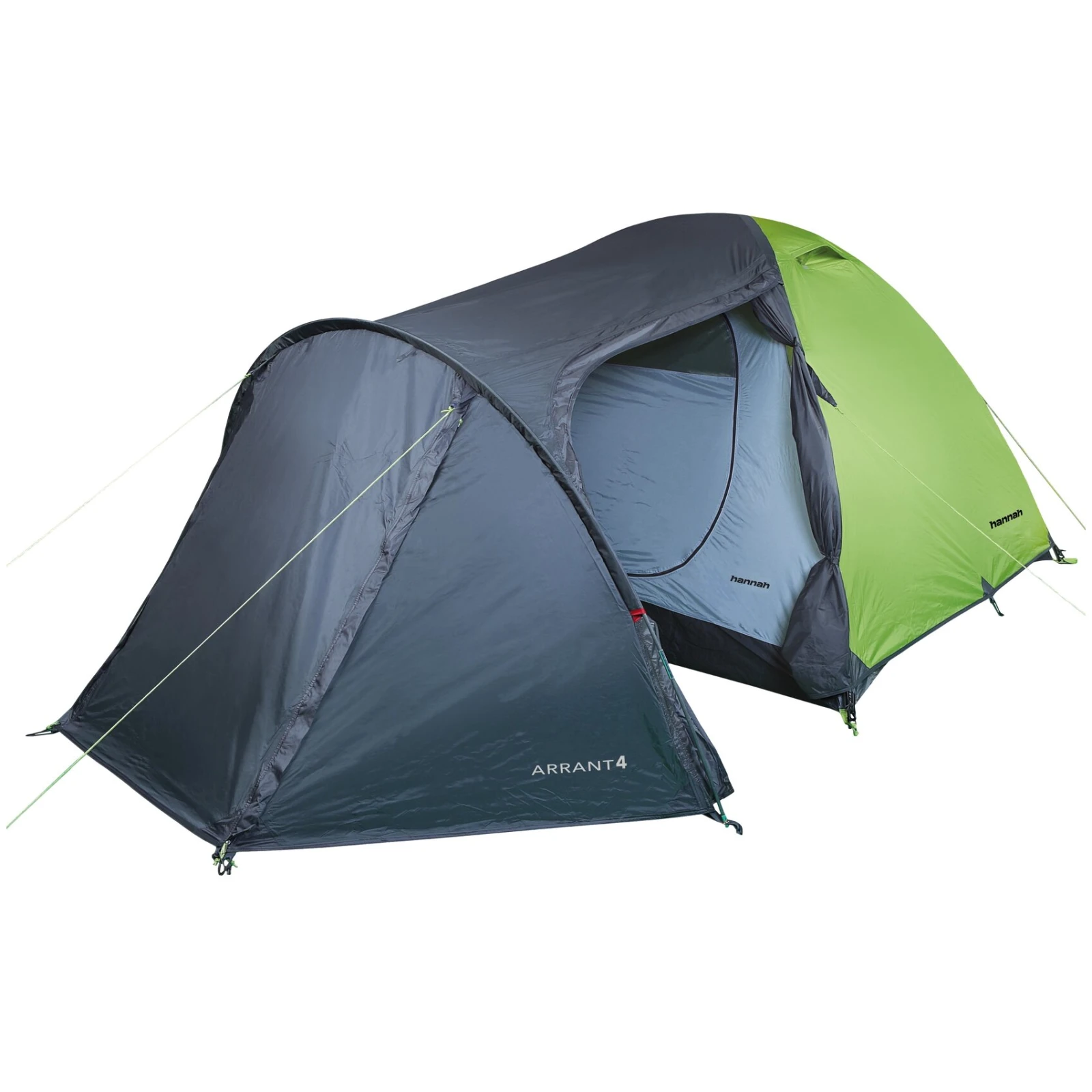 Das Zelt Arrant 4 des Herstellers Hannah mit einer geräumigen Apsis und einem Schlafzimmer im Innenaufbau verfügt über einen Eingang. Teilbelüftete Türen sind mit 2 zusätzlichen Belüftungslöchern ergänzt. Das Schlafzimmer verfügt über 2 Taschen und ein Deckenregal für Kleinigkeiten.