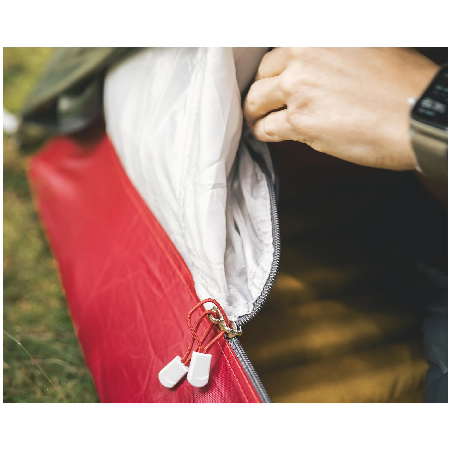 Darüber hinaus überzeugt das Zelt durch eine gute Luftzirkulationdank zwei gegenüberliegenden Eingängen, die auch einen bequemen Zugang ins Innere gewährleisten, einem atmungsaktiven Innenzelt, abgedeckten von innen regulierbarenBelüftungsöffnungen und einer zweigeteilten Tür, die separat geöffnet werden kann. Im Inneren befinden sich integrierte Netztaschen und Stauraum über Kopf. Zur leichteren Orientierung leuchten die Reißverschlüsse nachts.