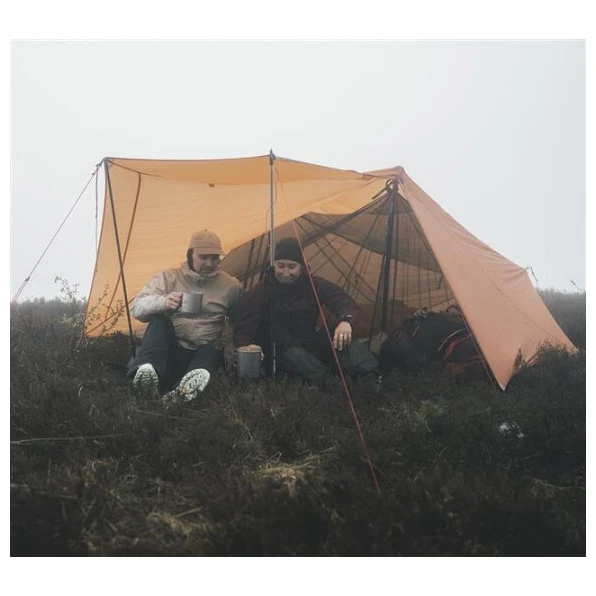 Die Konstruktion selbst besteht aus Wanderstöcken (nicht im Lieferumfang enthalten). Die Zeltenden sind mit Karbonstreben verstärkt, die den Kontakt des Schlafsacks mit dem Außenzelt verhindern. Das Zelt bietet vielfältige Aufstellmöglichkeiten – nur Außenzelt, nur Schlafzelt oder beides. Auf beiden Seiten befinden sich kleinere Vorräume für Ausrüstung, die gleichzeitig als zwei Eingänge dienen. Das Vorzelt am Eingang ist aufklappbar und bietet eine schöne Aussicht nach draußen. Insgesamt ist der Aufbau des Zeltes sehr einfach und schnell, und die Konstruktion hält auch starkem Wind stand.