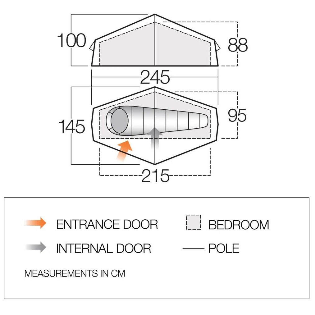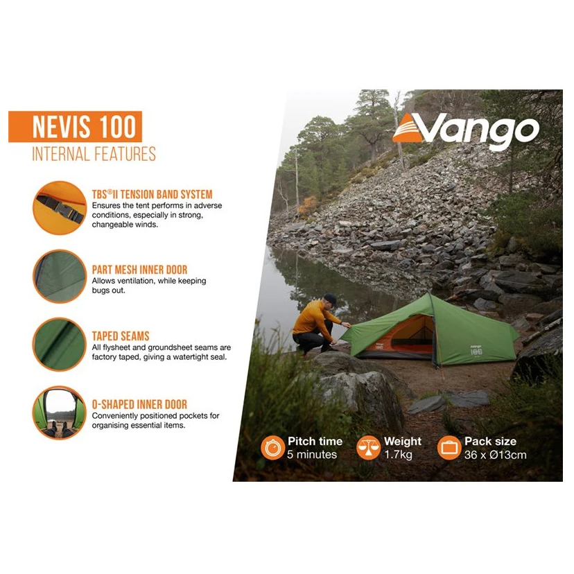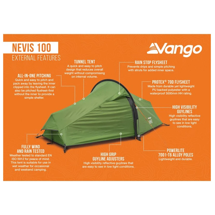 Das Campingzelt Nevis 100 der Marke Vango ist für Alleinabenteurer konzipiert, die ein leichtes und kompaktes Zelt suchen, das sie nicht im Stich lässt. Das Design dieser Serie ermöglicht es Ihnen, das Zelt auf zwei Arten aufzubauen. Sie können daher ein separates Überzelt bauen, das Sie als Unterstand verwenden können (Flysheet First) oder Sie bauen ein Überzelt mit integriertem Innenzelt (All-In-One Pitching). Die zweite Methode spart Zeit bei der Montage und Verpackung. Zur schnellen Konstruktion trägt auch eine einzelne Stange aus widerstandsfähigem Duraluminiumbei, die das Gesamtgewicht ebenfalls deutlich reduziert.