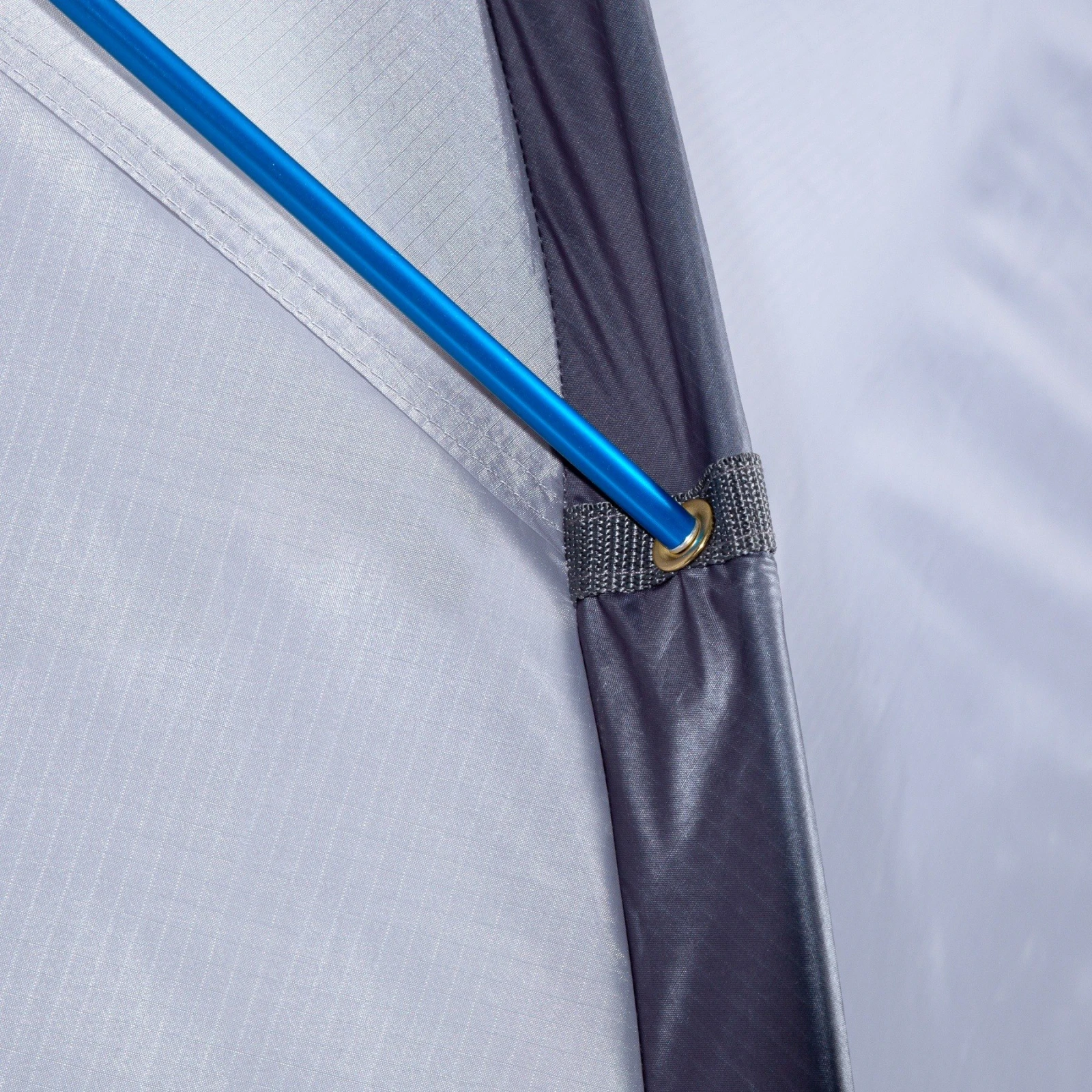 Wie bei der Zeltaußenkonstruktion üblich, sind das Außenzelt und die Schlafkabine bereits vormontiert. Fädeln Sie einfach die Stangen durch den Tunnel, der am anderen Ende geschlossen ist, und in nur 5 Minuten haben Sie das komplette Zelt aufgebaut.