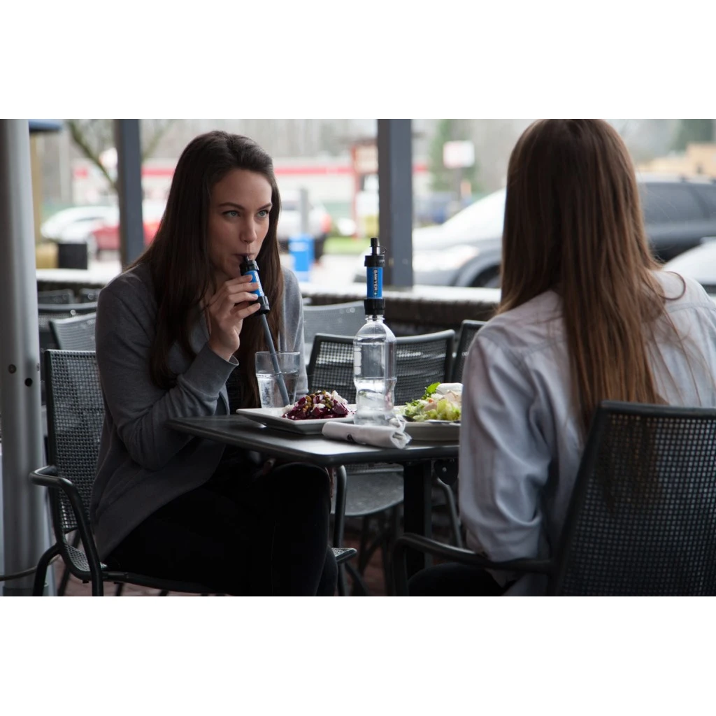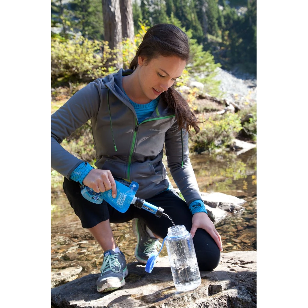 Die Anwendung ist ganz einfach und variabel. Sie können ihn an der mitgelieferten Roll-On-Flasche, an jeder PET-Flasche, an den meisten Trinkblasen anbringen oder ihn wie einen Strohhalm zum direkten Trinken aus der Quelle verwenden. Die im Vergleich zum Squeeze -Filter geringere Durchflussrate von 1,2 bis 1,5 l/min wird man ihm angesichts seiner Größe sicher verzeihen. Mit einer garantierten Lebensdauer von 378.000 Litern Wasser könnte es noch mehrere Generationen Ihrer Nachkommen nutzen (bei einem Verbrauch von 3 Litern pro Tag würde es für eine Nutzungsdauer von 345 Jahren reichen).