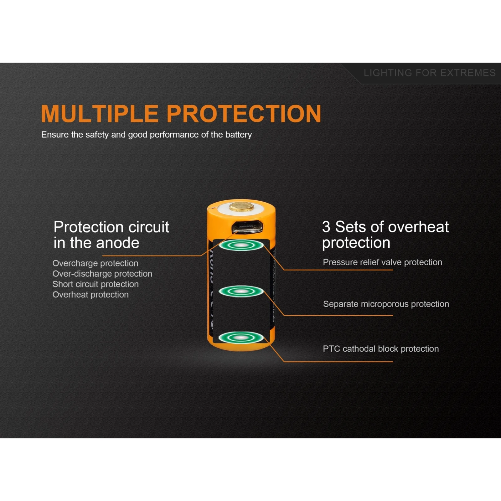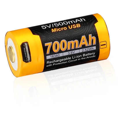 Wiederaufladbarer Akku Fenix ARB-L16-700UP (RCR123A, 16340) mit eigenem Micro-USB-Ladeanschluss. Das Aufladen erfolgt über ein Kabel an einem Micro-USB-Anschluss (z. B. vom Ladegerät eines Computers oder Mobiltelefons), in einem klassischen Ladegerät oder in aufladbaren Taschenlampen und Stirnlampen. Im Vergleich zum ARB-L16-700U Akku ist er für einen höheren Entladestrom (bis zu 2,5 A)ausgelegt. Es eignet sich daher besonders für Geräte mit höherem Stromverbrauch, zB. Lampen Fenix E16 und E18R. Die Lithium-Ionen-Technologie bietet eines der besten Verhältnisse von gespeicherter Energie zum Zellgewicht. Die Batterien haben keinen Memory-Effekt und die Selbstentladung ist minimal.