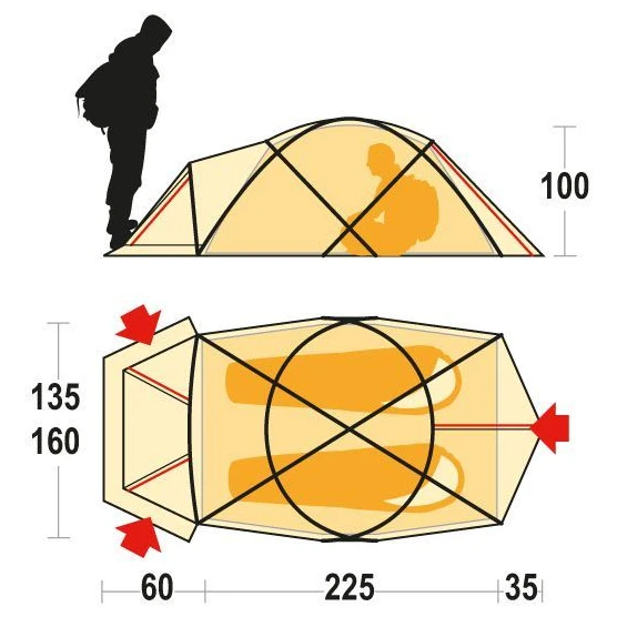 Das doppelwandige Expeditionszelt Snowbound 2 der Marke Ferrino ist eine ideale Wahl bei widrigen Bedingungen. Das Zelt bietet bequem Platz für 2 Personen und ist über zwei Eingänge, einen Vorder- und einen Hintereingang, zugänglich. Der Eingang zum Schlafzimmer lässt sich komplett öffnen und verfügt über eine Tasche zum Verstecken des Moskitonetzes. Einer der Eingänge verfügt über eine Apsis mit einem breiten Schneekragen , der aufgerollt werden kann, um die Luftzirkulation im Zelt zu verbessern. Das Zelt nutzt Tunnel zur Befestigung der Aluminiumstangen. Alle Stangen, bis auf eine, sind gleich lang, was den Zeltaufbau erleichtert. Die Stangen, die eine unterschiedliche Länge aufweisen, sind farblich unterscheidbar und dienen zum Bau eines Vorraums.