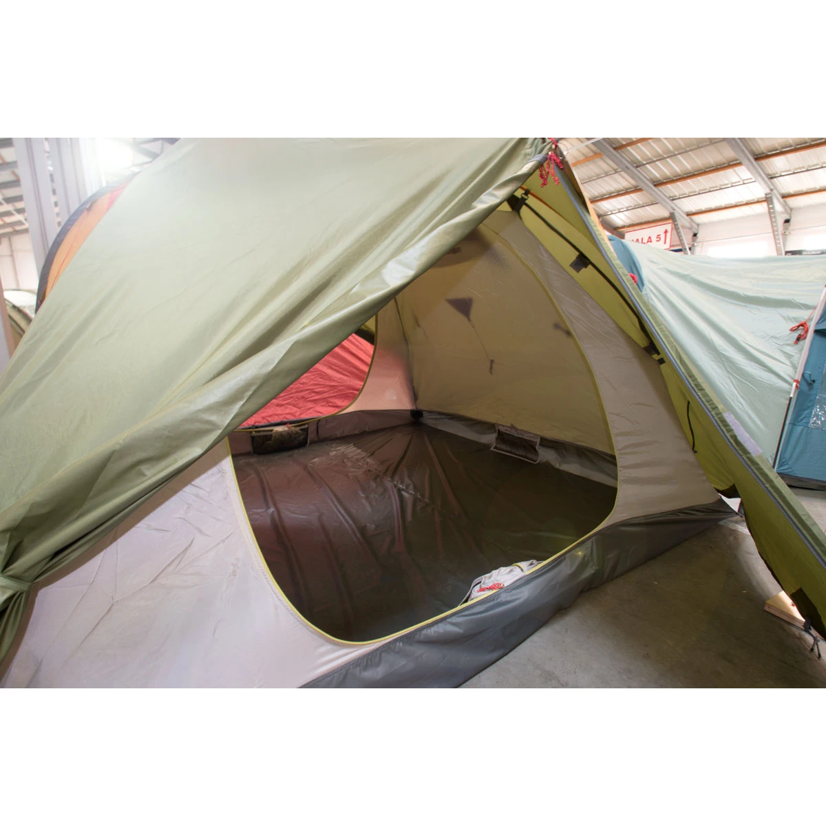 Das Zelt ist doppelwandig und besteht aus einem Innenzelt und einer Außenhülle – einem Überzelt. Das Innenzelt hat einen rechteckigen Grundriss mit zwei Eingängen an den längeren Seiten. Das Außenzelt ist sechseckig und verfügt ebenfalls über zwei Eingänge, in denen sich zwei dreieckige Apsiden befinden, passend zB. zur Gepäckaufbewahrung. Für beide Eingänge können wir entscheiden, ob wir die linke oder rechte Hälfte des Eingangs öffnen, oder beides gleichzeitig. Wir nutzen die Auswahlmöglichkeit beispielsweise für: beim Kochen, wo wir uns ganz einfach den nötigen Windschatten verschaffen können.