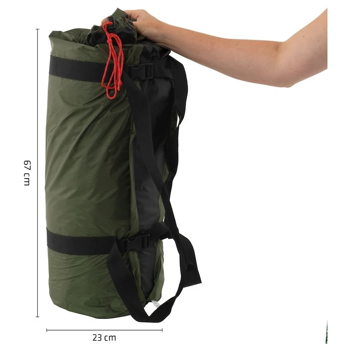 Zum Zelt gehört außerdem eine praktische Tasche mit großer Eingangsöffnung zum leichteren Packen und ein Reparaturset.