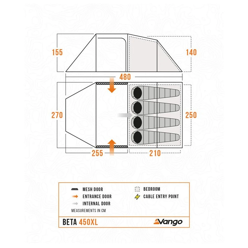 Das Vango Beta 450 XL ist ein doppelwandiges Tourenzelt für vier Personen, das über eine geräumige Apsis von 6,2 m² verfügt. Dieser Flur bietet viel Platz zum Entspannen und Abstellen von Dingen und ist über zwei Eingänge zugänglich. Einer der Eingänge ist mit einem Moskitonetz ausgestattet, welches wirksam vor Insekten schützt und zugleich für eine hervorragende Luftzirkulation sorgt. Am nach innen erweiterten Eingang befindet sich zudem ein teilweises Moskitonetz.