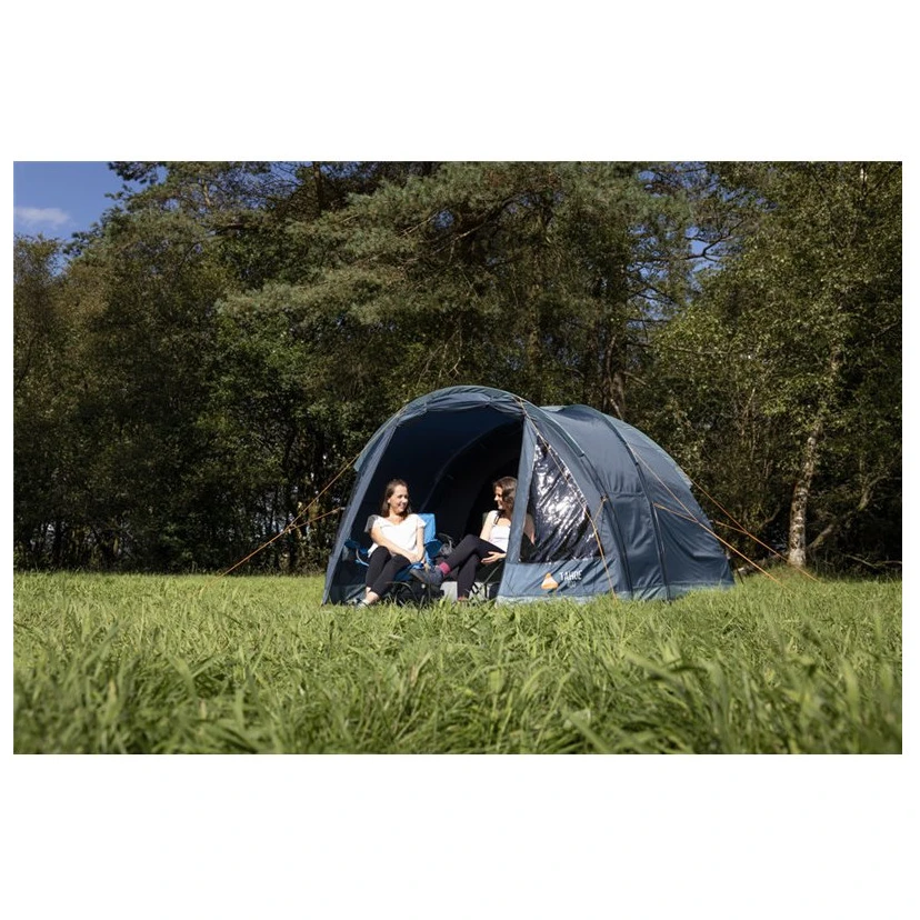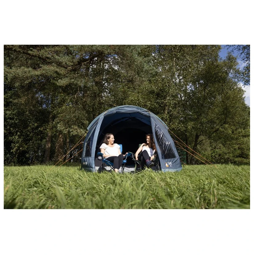 Das Zelt bietet eine hervorragende Belüftung, sodass es auch an warmen Sommertagen angenehm im Inneren ist, selbst wenn nur das Innenzelt verwendet wird. Drei geräumige Eingänge und ein Flur mit viel Stauraum sorgen für Komfort und erleichtern die Organisation Ihrer Sachen. Der Doppelboden gewährleistet Schutz vor Feuchtigkeit und Schmutz, während das Nightfall-Schlafzimmer auch im Morgenlicht einen ruhigen Schlaf ermöglicht.