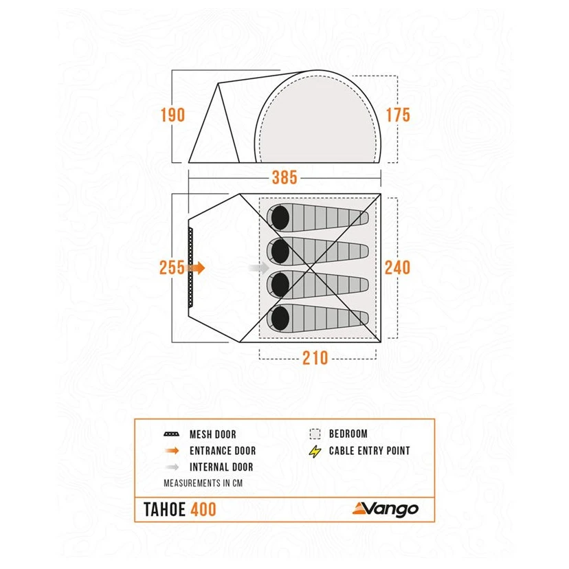 Das Zelt Vango Tahoe 400 ist die ideale Wahl für Familien und kleinere Gruppen, die ein geräumiges und zuverlässiges Zelt zum Campen bei unterschiedlichen Wetterbedingungen suchen. Dank der Konstruktion mit PowerFlex®-Fibreglasstangen ist das Zelt schnell und stabil aufzubauen. Das Verdeck aus dem Stoff Sentinel Active ist wasserdicht (4000 mm) und äußerst witterungsbeständig. Die ColourLok -Technologie sorgt für langanhaltende Farben.