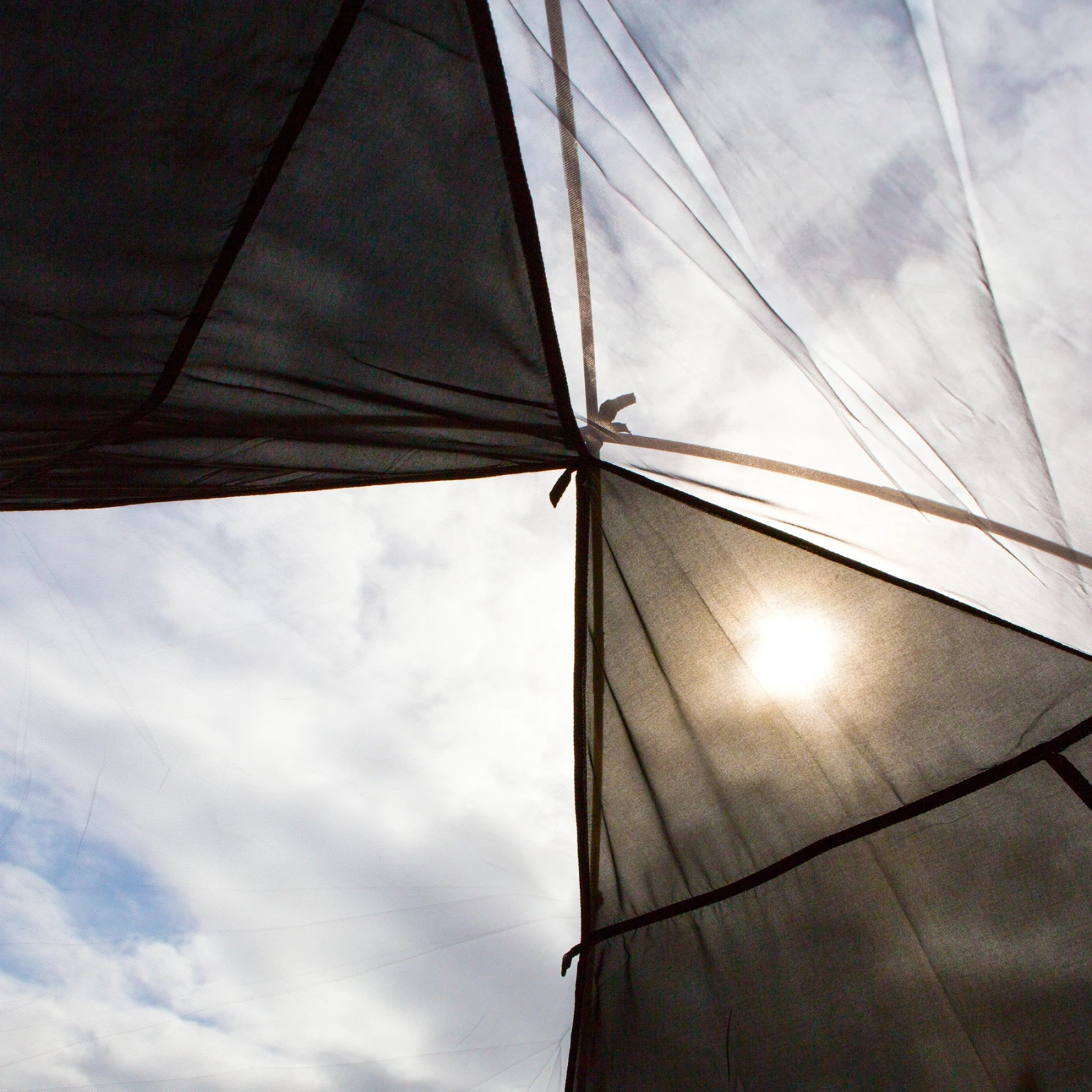 Die Belüftung befindet sich oben auf der Kuppel des Baldachins. Die Dächer der Lüftungsfenster sind so geformt, dass sie vom Wind nicht heruntergeklappt werden und bei Bedarf mit Klettverschlüssen verschlossen werden können. Dadurch wird ein Auslaufen auch bei Regen und starkem Wind verhindert.