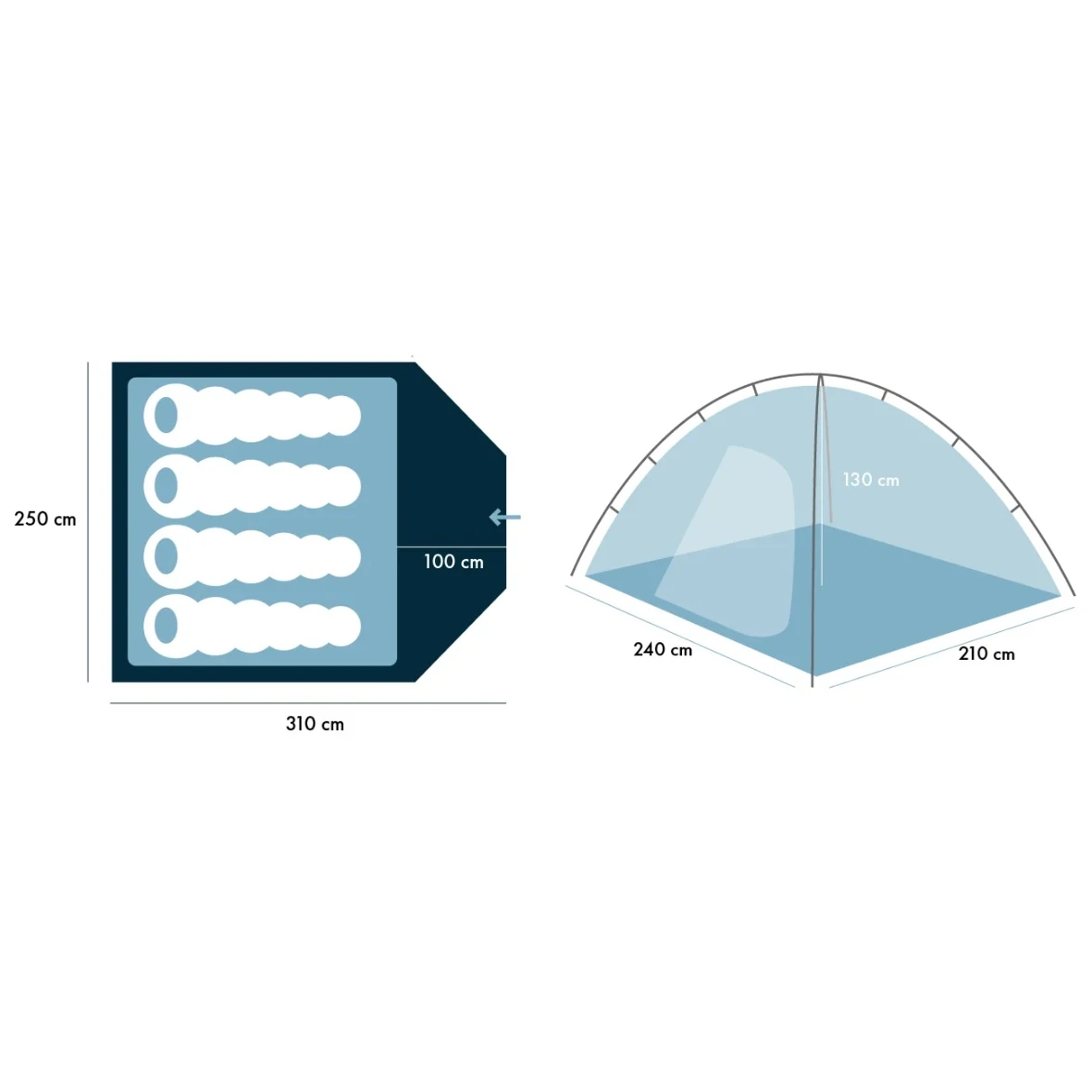 Im geräumigen Vorraum des Zelts Dome 4 Plus Black der Marke Zulu können Sie Ihr gesamtes Hab und Gut verstauen und bei Regen auch hier kochen. Ein Zelt mit einem Eingang, das sehr einfach aufzubauen ist. Klassische freitragende Struktur mit großer Apsis zur Gepäckaufbewahrung. Das Zelt ist zum Campen hauptsächlich von Frühjahr bis Herbst geeignet.