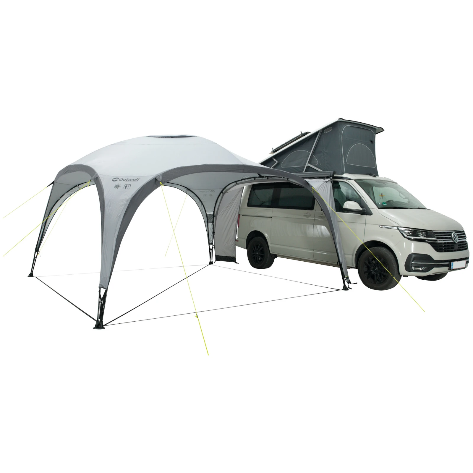 Dank der Lounge Vehicle Connection XL-Verbindungsvorrichtung Outwell können Sie Ihr Wohnmobil schnell und einfach mit einem Partyzelt verbinden und erhalten so zusätzlichen überdachten Wohnraum.