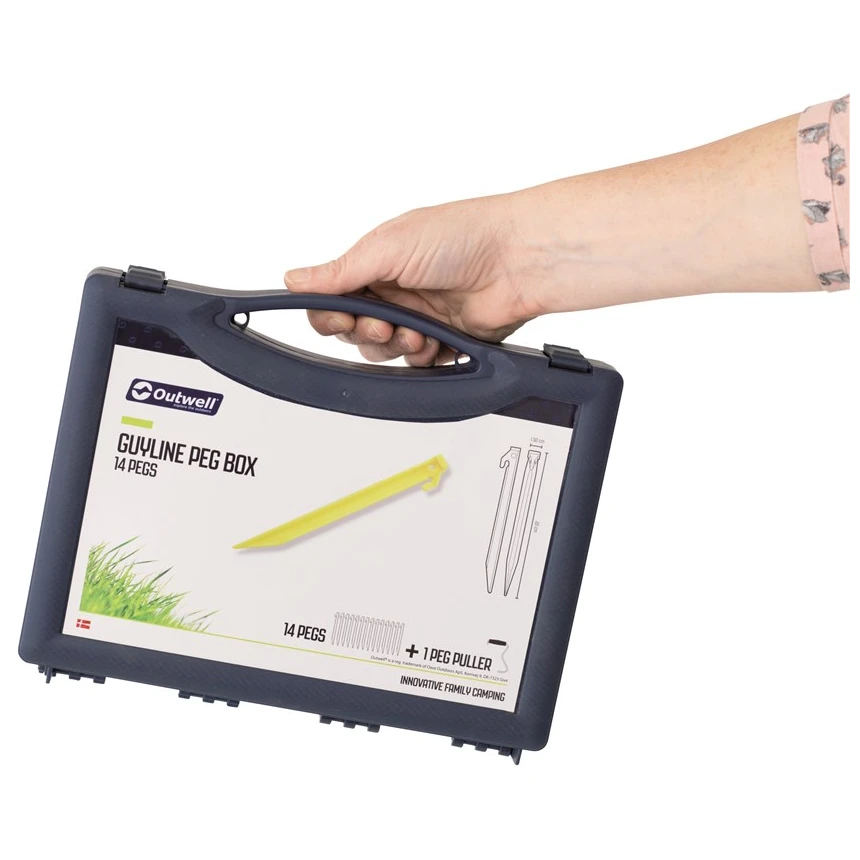Das praktische Heringsset Outwell Guyline Peg Box beinhaltet 14 Kunststoff-Heringe, einen Heringslöser und eine Tragetasche.